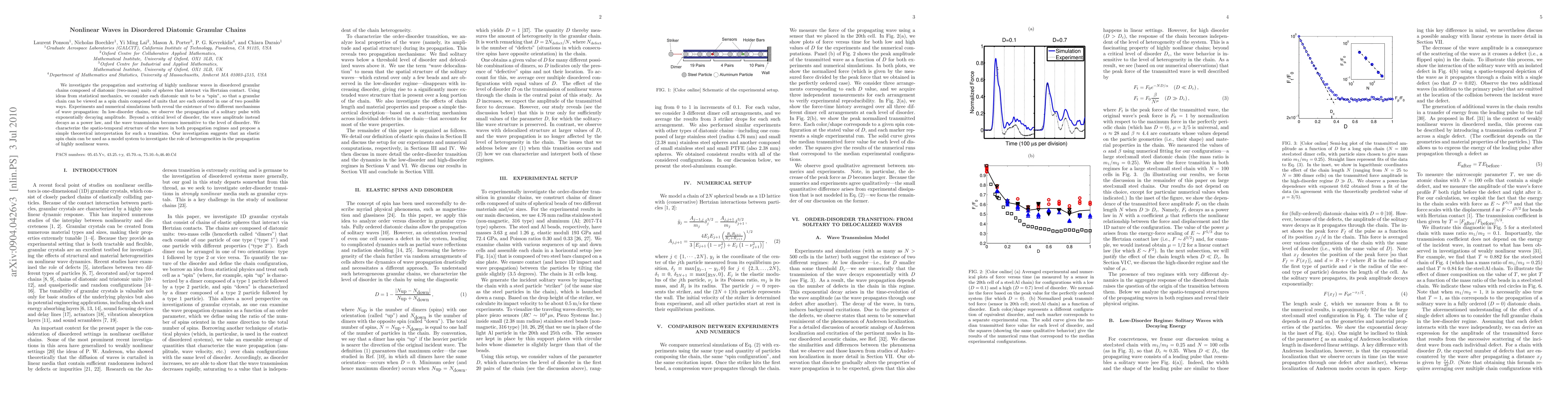 This paper investigates nonlinear wave propagation in disordered diatomic granular chains, revealing two distinct wave behaviors: solitary pulses in low-disorder chains and power-law decay in high-disorder chains. The study proposes a theoretical framework to explain the transition and suggests the system can model heterogeneities in nonlinear wave dynamics.
