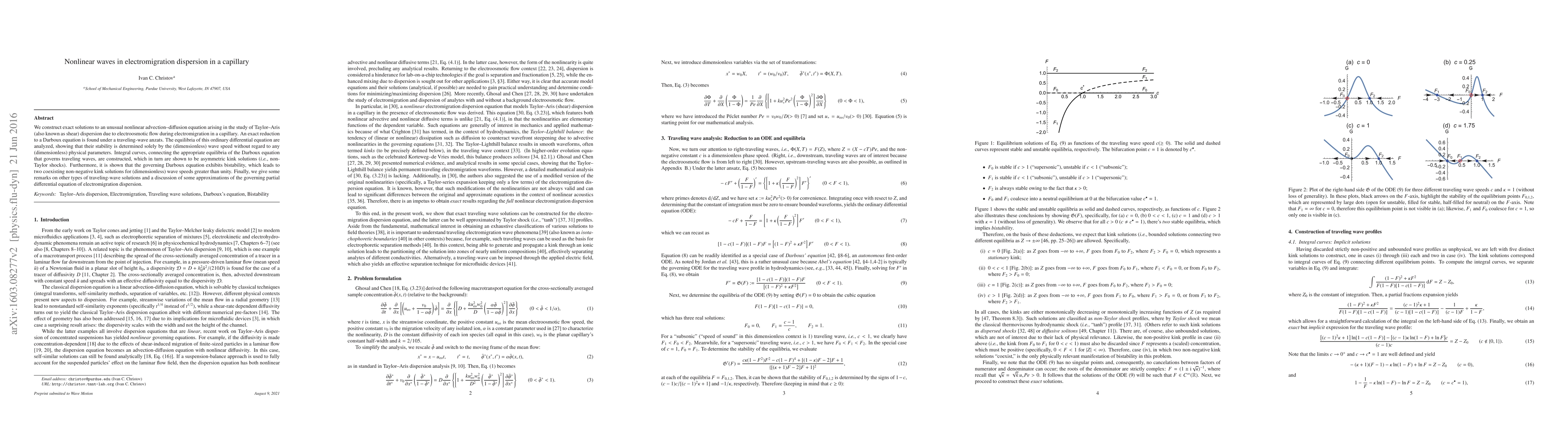 We construct exact solutions to an unusual nonlinear advection--diffusion equation arising in the study of Taylor--Aris (also known as shear) dispersion due to electroosmotic flow during electromigration in a capillary. An exact reduction to a Darboux equation is found under a traveling-wave anzats. The equilibria of this ordinary differential equation are analyzed, showing that their stability is determined solely by the (dimensionless) wave speed without regard to any (dimensionless) physical parameters. Integral curves, connecting the appropriate equilibria of the Darboux equation that governs traveling waves, are constructed, which in turn are shown to be asymmetric kink solutions ({\it i.e.}, non-Taylor shocks). Furthermore, it is shown that the governing Darboux equation exhibits bistability, which leads to two coexisting non-negative kink solutions for (dimensionless) wave speeds greater than unity. Finally, we give some remarks on other types of traveling-wave solutions and a discussion of some approximations of the governing partial differential equation of electromigration dispersion.