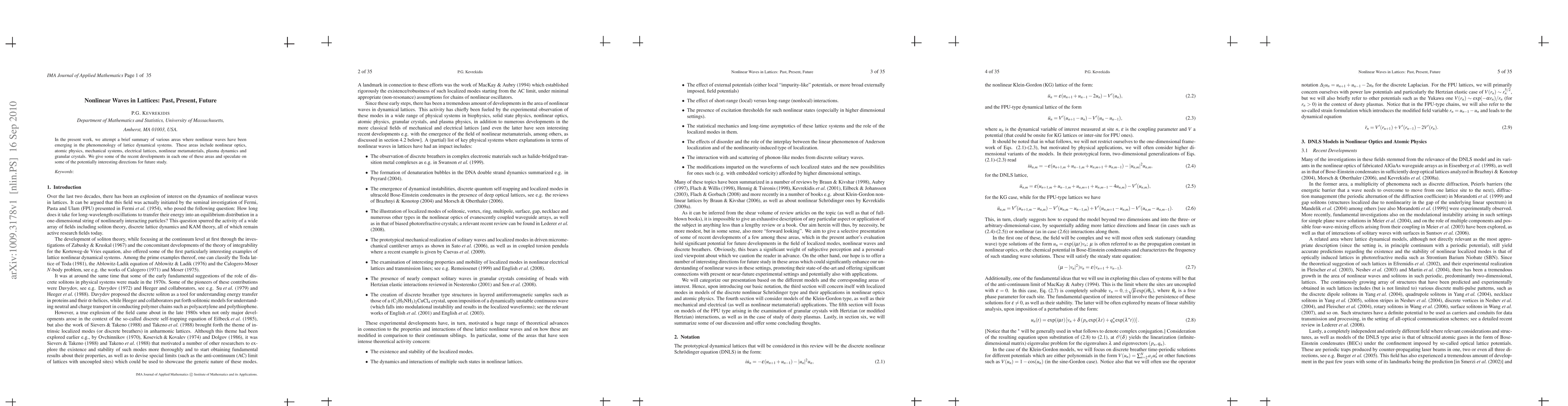 In the present work, we attempt a brief summary of various areas where nonlinear waves have been emerging in the phenomenology of lattice dynamical systems. These areas include nonlinear optics, atomic physics, mechanical systems, electrical lattices, nonlinear metamaterials, plasma dynamics and granular crystals. We give some of the recent developments in each one of these areas and speculate on some of the potentially interesting directions for future study.