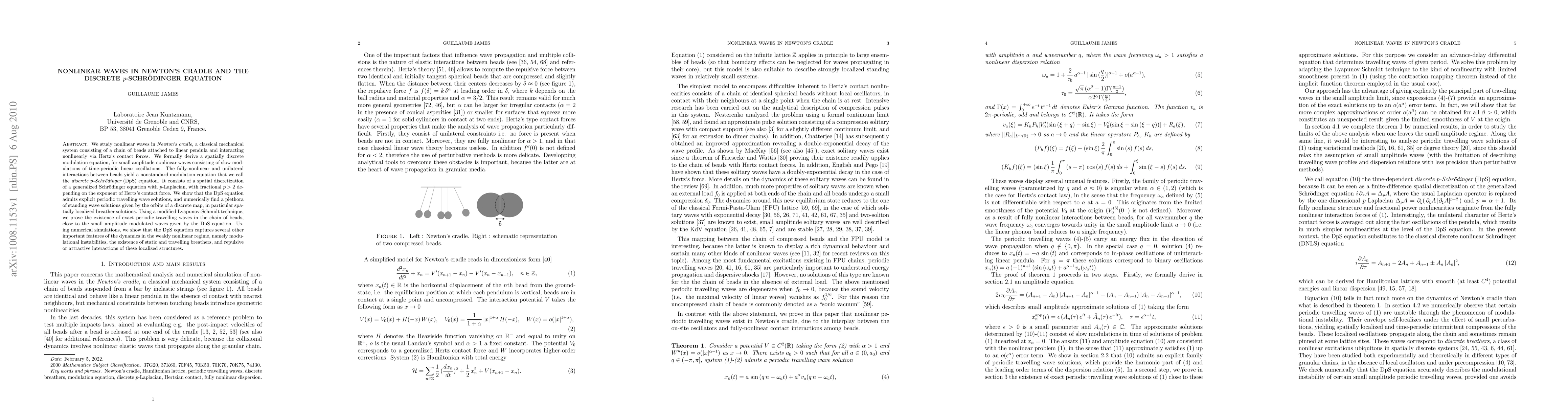 This paper studies nonlinear waves in Newton's cradle, deriving a novel discrete p-Schrodinger equation (DpS) to model its dynamics. The DpS equation exhibits explicit periodic travelling wave solutions and a variety of standing wave solutions, including spatially localized breathers, capturing modulational instabilities and interactions of localized structures.