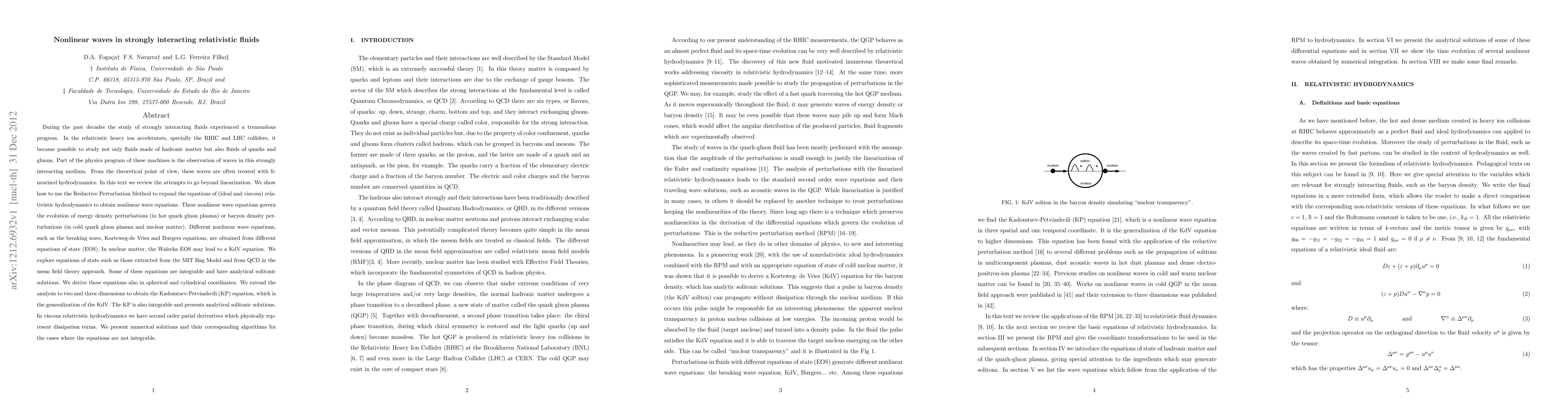 This paper reviews the development of nonlinear wave equations in strongly interacting relativistic fluids, derived using the Reductive Perturbation Method. It explores the evolution of energy and baryon density perturbations through equations like the breaking wave, KdV, and Burgers, and extends the analysis to two and three dimensions, obtaining the integrable Kadomtsev-Petviashvili (KP) equation with solitonic solutions.