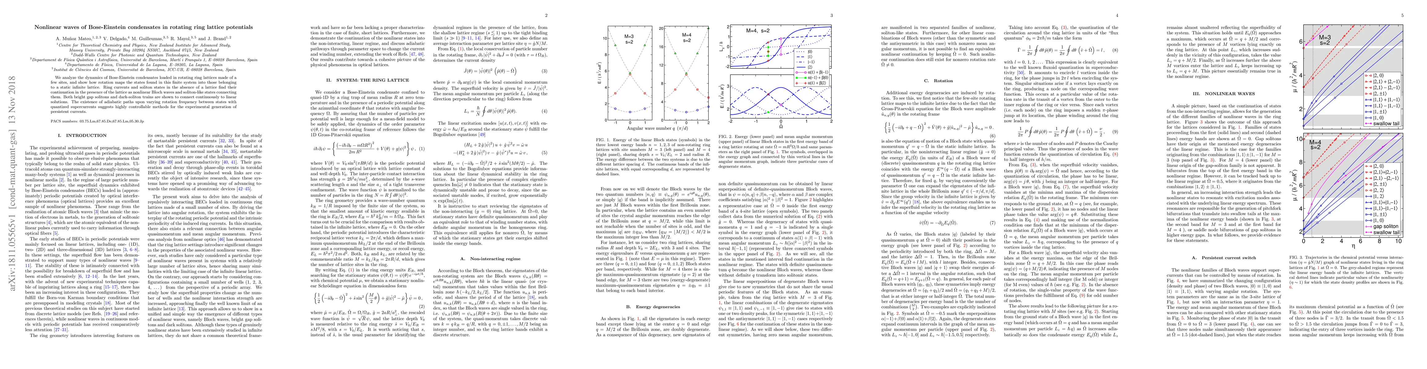 This paper investigates the dynamics of Bose-Einstein condensates in rotating ring lattices, demonstrating how rotation transforms finite system states into those of an infinite static lattice. It reveals the emergence of nonlinear Bloch waves and soliton-like states, including bright gap solitons and dark-soliton trains, suggesting controllable methods for generating persistent currents.