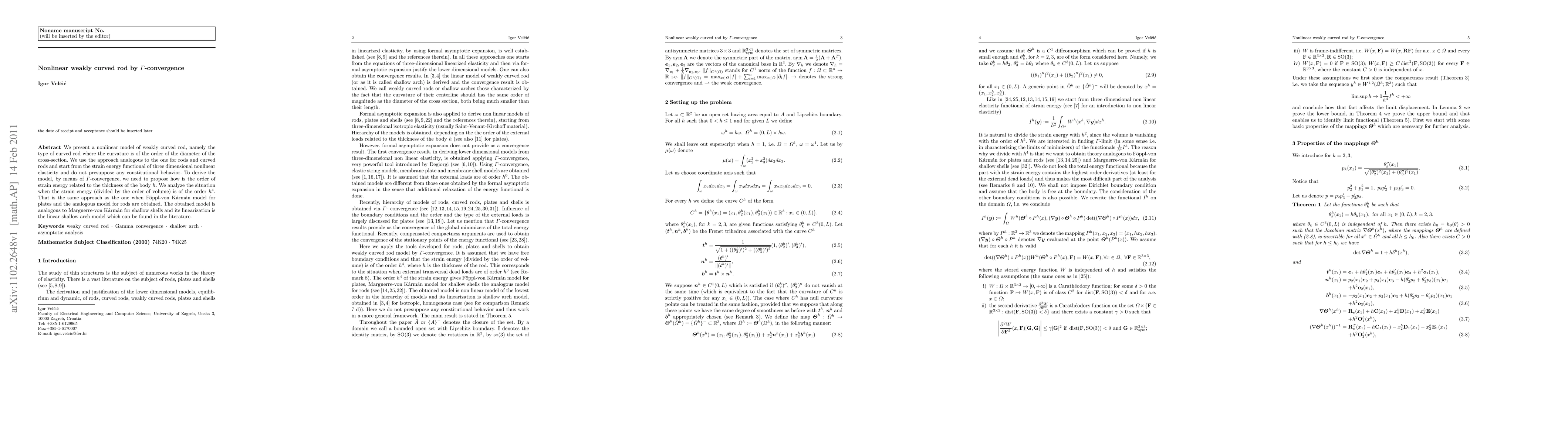 We present a nonlinear model of weakly curved rod, namely the type of curved rod where the curvature is of the order of the diameter of the cross-section. We use the approach analogous to the one for rods and curved rods and start from the strain energy functional of three dimensional nonlinear elasticity and do not presuppose any constitutional behavior. To derive the model, by means of $\Gamma$-convergence, we need to propose how is the order of strain energy related to the thickness of the body $h$. We analyze the situation when the strain energy (divided by the order of volume) is of the order $h^4$. That is the same approach as the one when F\"oppl-von K\'arm\'an model for plates and the analogous model for rods are obtained. The obtained model is analogous to Marguerre-von K\'arm\'an for shallow shells and its linearization is the linear shallow arch model which can be found in the literature.