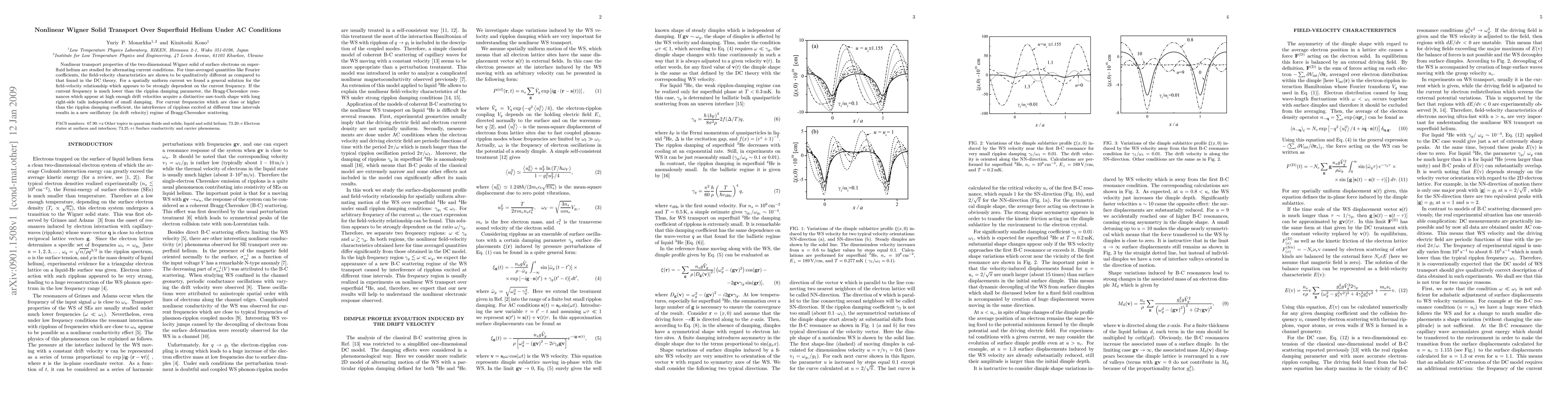 Nonlinear transport properties of the two-dimensional Wigner solid of surface electrons on superfluid helium are studied for alternating current conditions. For time-averaged quantities like Fourier coefficients, the field-velocity characteristics are shown to be qualitatively different as compared to that found in the DC theory. For a spatially uniform current we found a general solution for the field-velocity relationship which appears to be strongly dependent on the current frequency. If the current frequency is much lower than the ripplon damping parameter, the Bragg-Cherenkov resonances which appear at high enough drift velocities acquire a distinctive saw-tooth shape with long right-side tails independent of small damping. For current frequencies which are close or higher than the ripplon damping coefficient, the interference of ripplons excited at different time intervals results in a new oscillatory (in drift velocity) regime of Bragg-Cherenkov scattering.