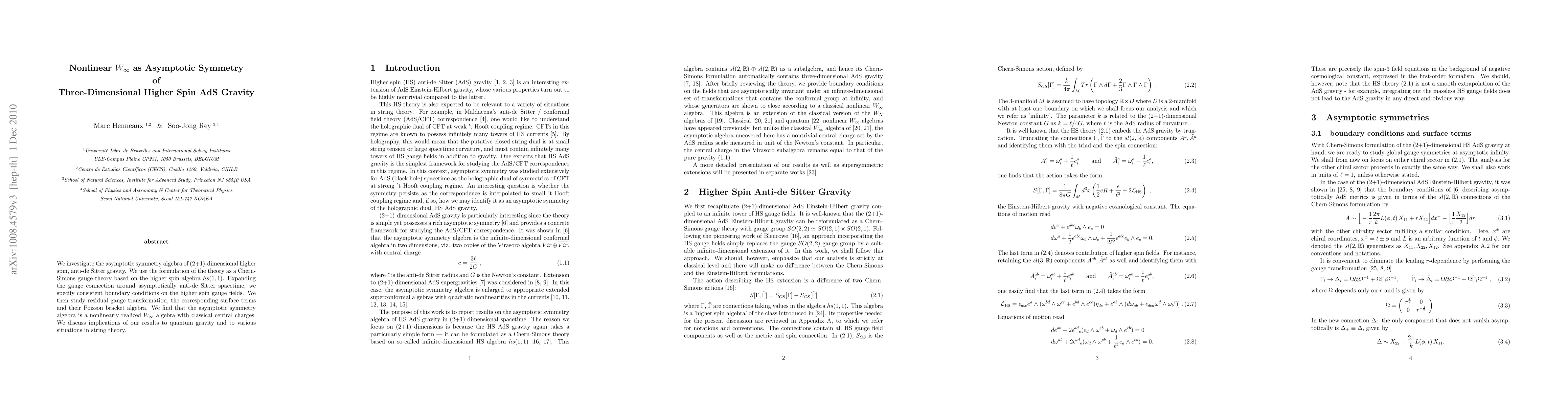 This paper identifies the asymptotic symmetry algebra of three-dimensional higher spin anti-de Sitter gravity as a nonlinearly deformed W(infinity) algebra, with implications for quantum gravity and string theory. The investigation employs Chern-Simons gauge theory based on the hs(1,1) algebra and examines residual gauge transformations and their Poisson bracket algebra.