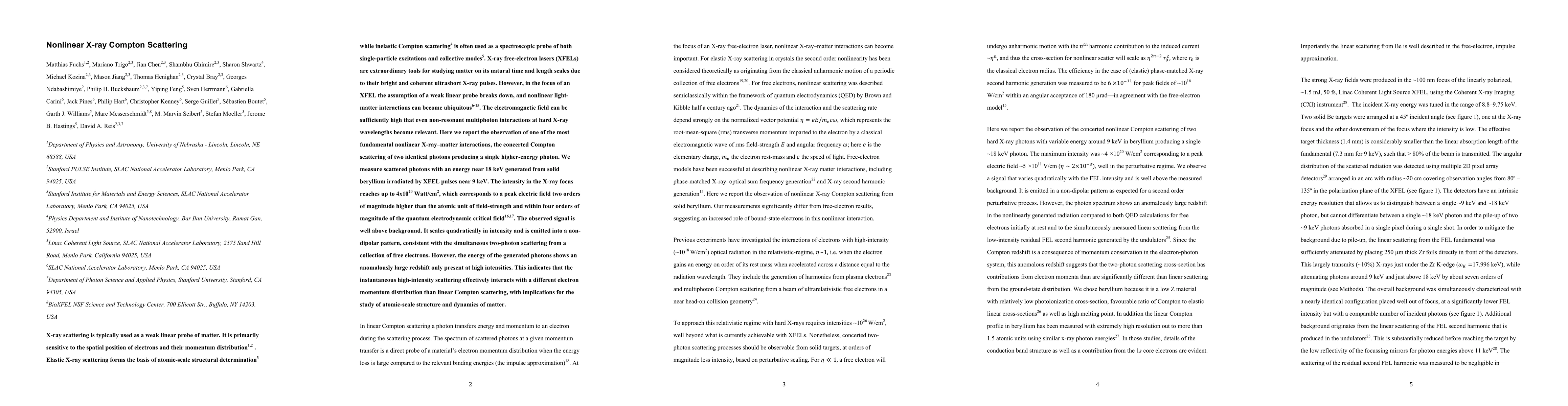 This paper reports the observation of nonlinear X-ray Compton scattering, where two identical photons from an XFEL simultaneously scatter off free electrons, producing a photon with nearly twice the initial energy. The study highlights the unique interactions occurring at high intensities, showing a quadratic intensity dependence and a non-dipolar emission pattern.