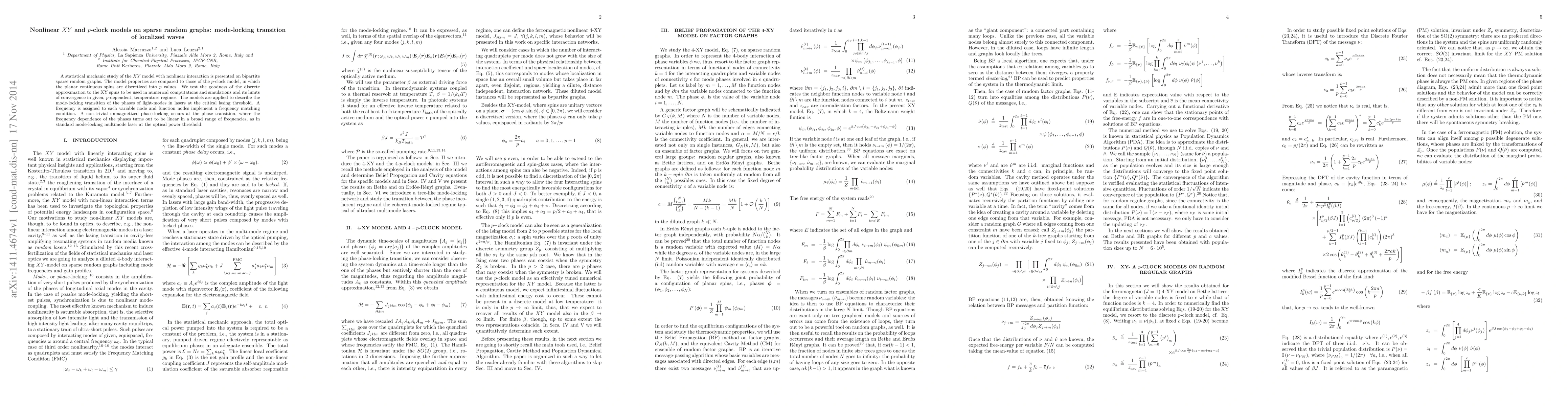 A statistical mechanic study of the $XY$ model with nonlinear interaction is presented on bipartite sparse random graphs. The model properties are compared to those of the $p$-clock model, in which the planar continuous spins are discretized into $p$ values. We test the goodness of the discrete approximation to the XY spins to be used in numerical computations and simulations and its limits of convergence in given, $p$-dependent, temperature regimes. The models are applied to describe the mode-locking transition of the phases of light-modes in lasers at the critical lasing threshold. A frequency is assigned to each variable node and function nodes implement a frequency matching condition. A non-trivial unmagnetized phase-locking occurs at the phase transition, where the frequency dependence of the phases turns out to be linear in a broad range of frequencies, as in standard mode-locking multimode laser at the optical power threshold.