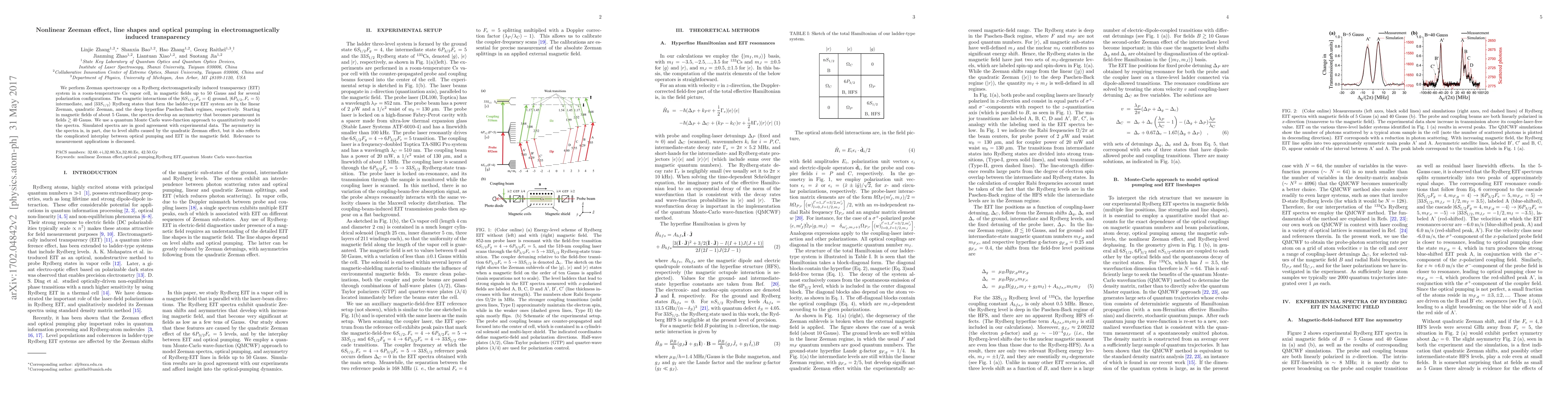 This paper investigates the nonlinear Zeeman effect on a Rydberg electromagnetically induced transparency (EIT) system in Cs vapor, observing spectral asymmetry in magnetic fields up to 50 Gauss. The study uses quantum Monte Carlo simulations to model the spectra, which are in good agreement with experiments, showing that the asymmetry is due to the quadratic Zeeman effect and optical pumping interactions.