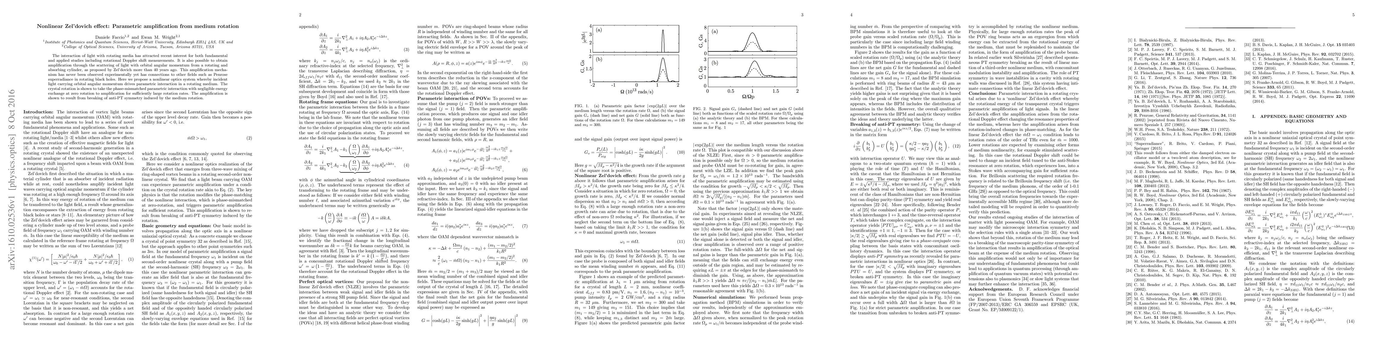 The interaction of light with rotating media has attracted recent interest for both fundamental and applied studies including rotational Doppler shift measurements. It is also possible to obtain amplification through the scattering of light with orbital angular momentum from a rotating and absorbing cylinder, as proposed by Zel'dovich more than 40 years ago. This amplification mechanism has never been observed experimentally yet has connections to other fields such as Penrose superradiance in rotating black holes. Here we propose a nonlinear optics system whereby incident light carrying orbital angular momentum drives parametric interaction in a rotating medium. The crystal rotation is shown to take the phase-mismatched parametric interaction with negligible energy exchange at zero rotation to amplification for sufficiently large rotation rates. The amplification is shown to result from breaking of anti-PT symmetry induced by the medium rotation.