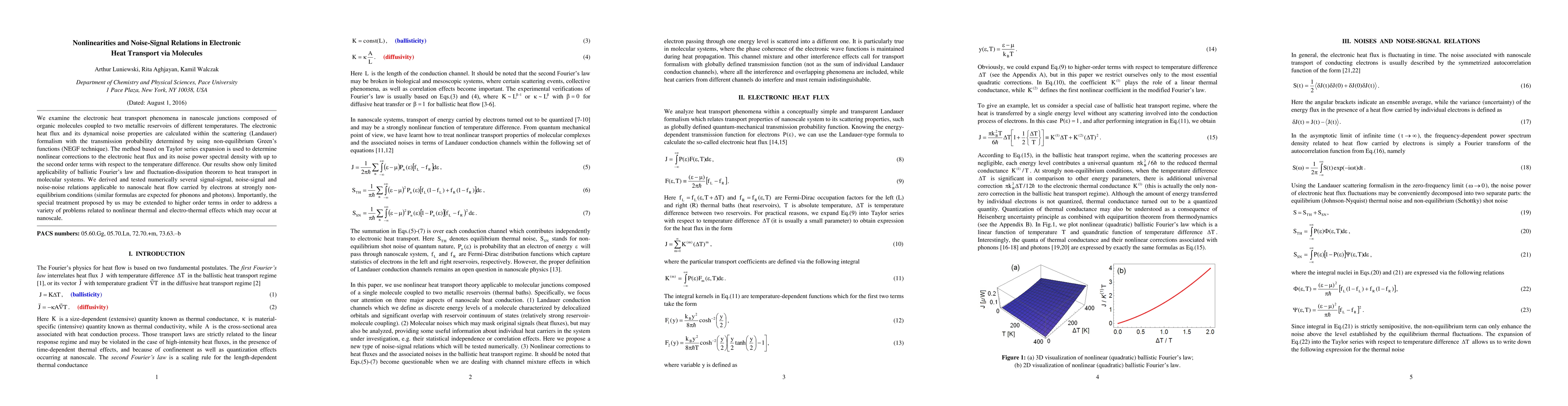 We examine the electronic heat transport phenomena in nanoscale junctions composed of organic molecules coupled to two metallic reservoirs of different temperatures. The electronic heat flux and its dynamical noise properties are calculated within the scattering (Landauer) formalism with the transmission probability determined by using non-equilibrium Green's functions (NEGF technique). The method based on Taylor series expansion is used to determine nonlinear corrections to the electronic heat flux and its noise power spectral density with up to the second order terms with respect to the temperature difference. Our results show only limited applicability of ballistic Fourier's law and fluctuation-dissipation theorem to heat transport in molecular systems. We derived and tested numerically several signal-signal, noise-signal, and noise-noise relations applicable to nanoscale heat flow carried by electrons at strongly non-equilibrium conditions (similar formulas are expected for phonons and photons). Importantly, the special treatment proposed by us may be extended to higher order terms in order to address a variety of problems related to nonlinear thermal and electro-thermal effects which may occur at nanoscale.
