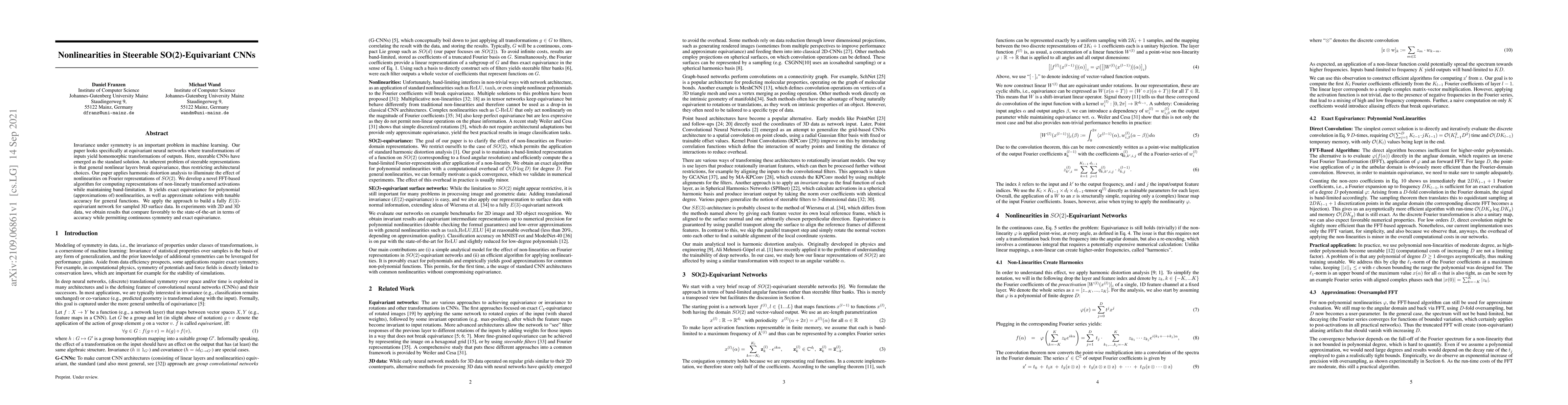 This paper investigates the impact of nonlinearities on steerable SO(2)-equivariant CNNs, proposing a novel FFT-based algorithm to maintain equivariance under transformations. The approach achieves exact equivariance for polynomial nonlinearities and approximate solutions for general functions, leading to competitive results in 2D and 3D data experiments.