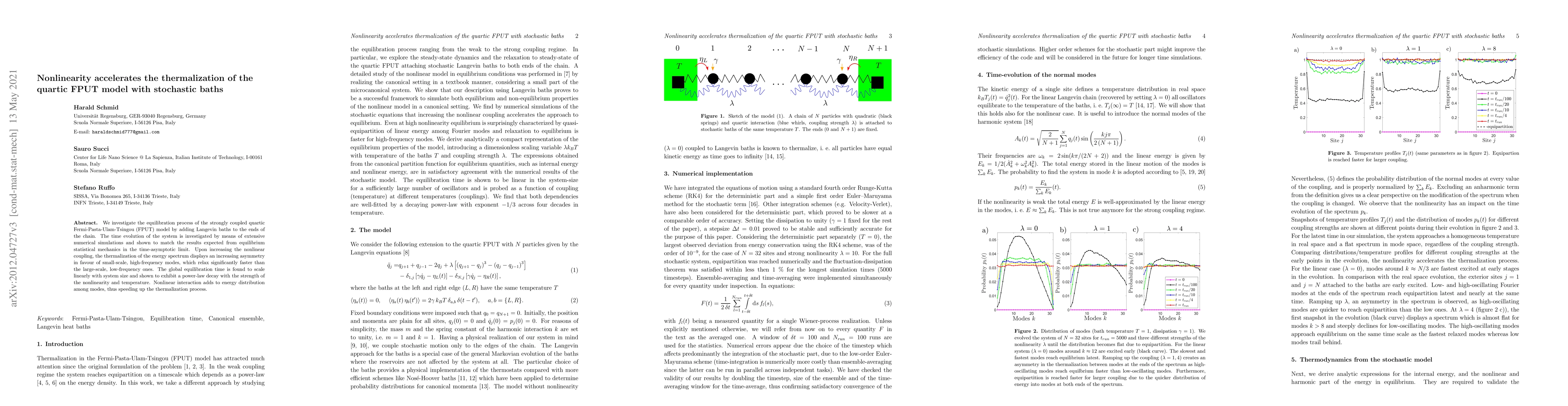 The research examines the quartic Fermi-Pasta-Ulam-Tamosi (FPUT) model's thermalization using Langevin baths, revealing that increased nonlinear coupling accelerates energy distribution among modes, leading to faster equilibration of high-frequency modes. The global equilibration time scales linearly with system size and decays with nonlinearity and temperature strength.