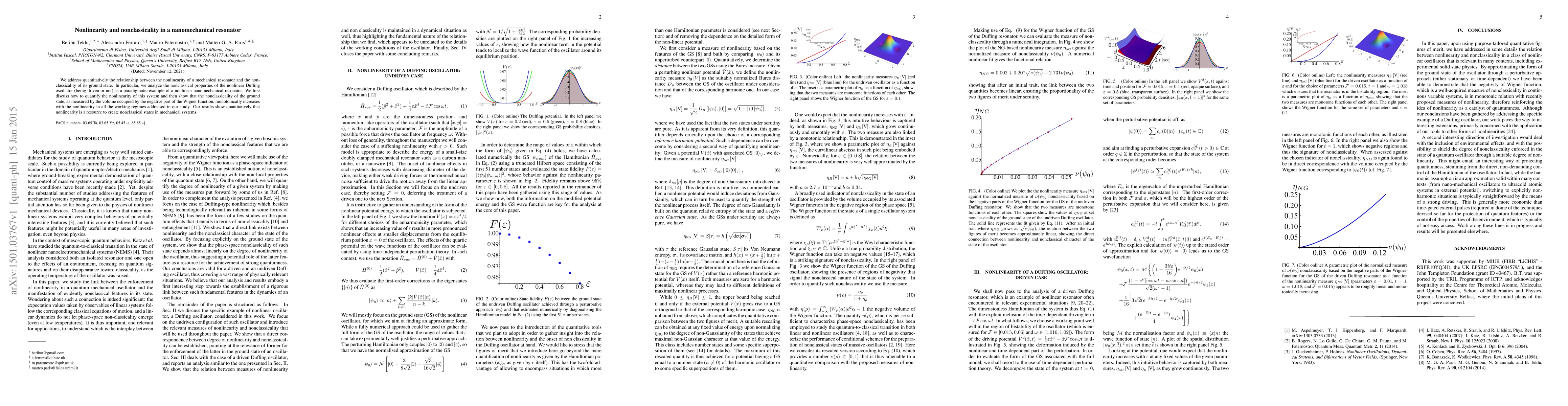 We address quantitatively the relationship between the nonlinearity of a mechanical resonator and the nonclassicality of its ground state. In particular, we analyze the nonclassical properties of the nonlinear Duffing oscillator (being driven or not) as a paradigmatic example of a nonlinear nanomechanical resonator. We first discuss how to quantify the nonlinearity of this system and then show that the nonclassicality of the ground state, as measured by the volume occupied by the negative part of the Wigner function, monotonically increases with the nonlinearity in all the working regimes addressed in our study. Our results show quantitatively that nonlinearity is a resource to create nonclassical states in mechanical systems.