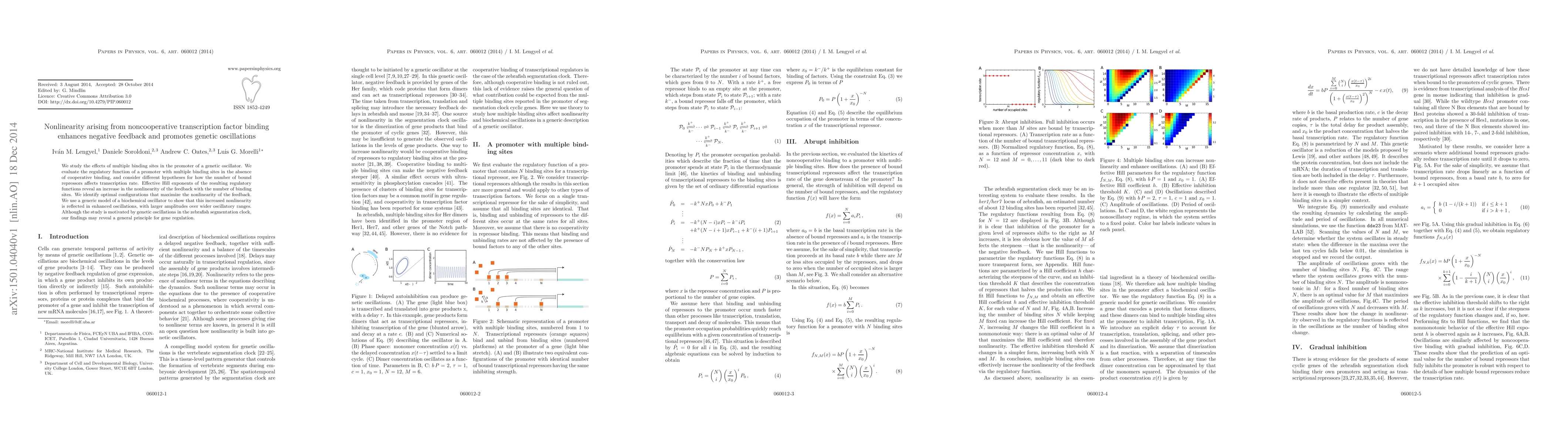 We study the effects of multiple binding sites in the promoter of a genetic oscillator. We evaluate the regulatory function of a promoter with multiple binding sites in the absence of cooperative binding, and consider different hypotheses for how the number of bound repressors affects transcription rate. Effective Hill exponents of the resulting regulatory functions reveal an increase in the nonlinearity of the feedback with the number of binding sites. We identify optimal configurations that maximize the nonlinearity of the feedback. We use a generic model of a biochemical oscillator to show that this increased nonlinearity is reflected in enhanced oscillations, with larger amplitudes over wider oscillatory ranges. Although the study is motivated by genetic oscillations in the zebrafish segmentation clock, our findings may reveal a general principle for gene regulation.