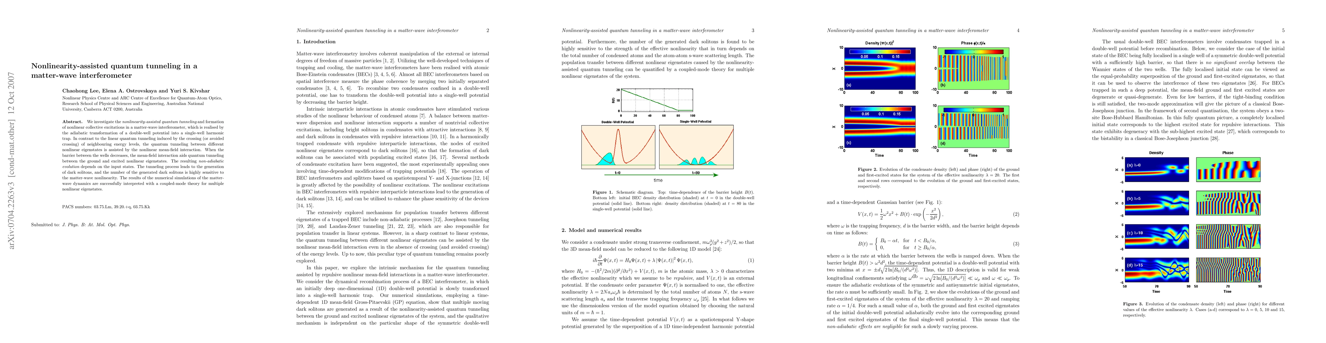 We investigate the {\em nonlinearity-assisted quantum tunneling} and formation of nonlinear collective excitations in a matter-wave interferometer, which is realised by the adiabatic transformation of a double-well potential into a single-well harmonic trap. In contrast to the linear quantum tunneling induced by the crossing (or avoided crossing) of neighbouring energy levels, the quantum tunneling between different nonlinear eigenstates is assisted by the nonlinear mean-field interaction. When the barrier between the wells decreases, the mean-field interaction aids quantum tunneling between the ground and excited nonlinear eigenstates. The resulting {\em non-adiabatic evolution} depends on the input states. The tunneling process leads to the generation of dark solitons, and the number of the generated dark solitons is highly sensitive to the matter-wave nonlinearity. The results of the numerical simulations of the matter-wave dynamics are successfully interpreted with a coupled-mode theory for multiple nonlinear eigenstates.