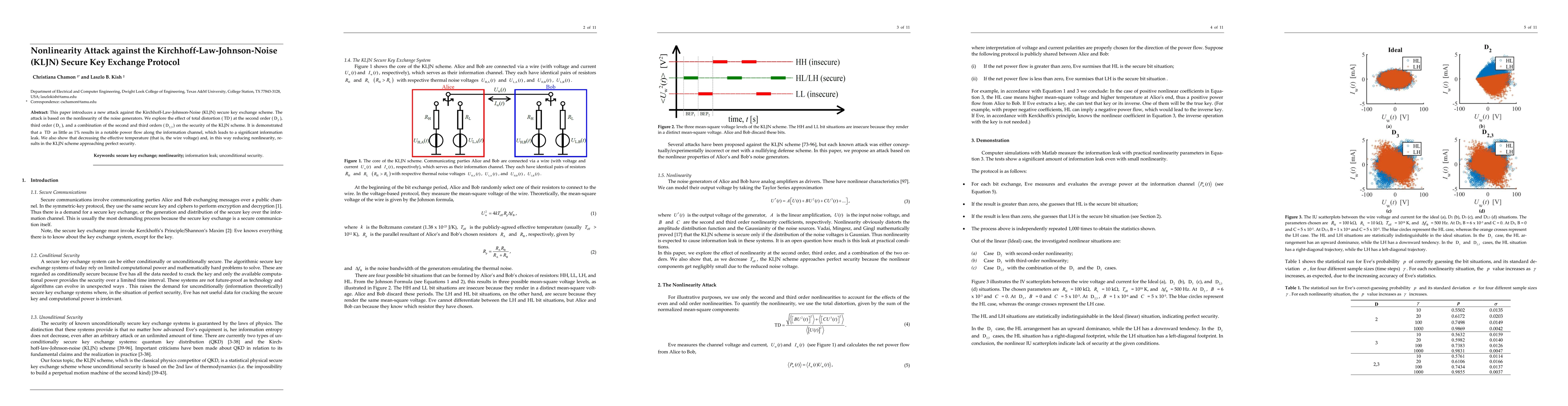 This paper presents a nonlinearity attack on the KLJN secure key exchange protocol, revealing that even minor distortions (as low as 1%) lead to significant information leakage. Reducing effective temperature and nonlinearity improves the scheme's security.