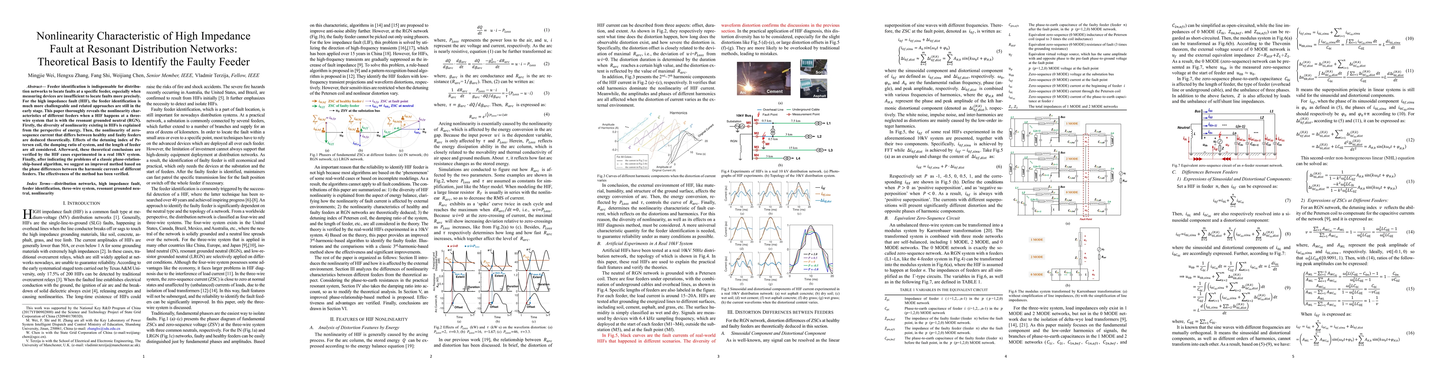 Feeder identification is indispensable for distribution networks to locate faults at a specific feeder, especially when measuring de-vices are insufficient for precise locations. For the high imped-ance fault (HIF), the feeder identification is much more compli-cated and related approaches are still in the early stage. This paper thoroughly and theoretically reveals the features of dif-ferent feeders when a HIF happens at the resonant grounded neutral (RGN) network, which is the most challenging condition for feeder identification. Firstly, the diversity of nonlinearity existing in HIFs is explained from the aspect of energy. Then, the differences of nonlinearities of zero-sequence currents between healthy and faulty feeders are deduced theoretically. Variations of the detuning index and damping ratio that exist in industries are both considered. Afterward, these theoretical conclusions are verified by the HIF cases experimented in a real 10kV system. Finally, based on the theories, we discuss about why the existing approaches are not reliable enough, and suggest some improve-ments.