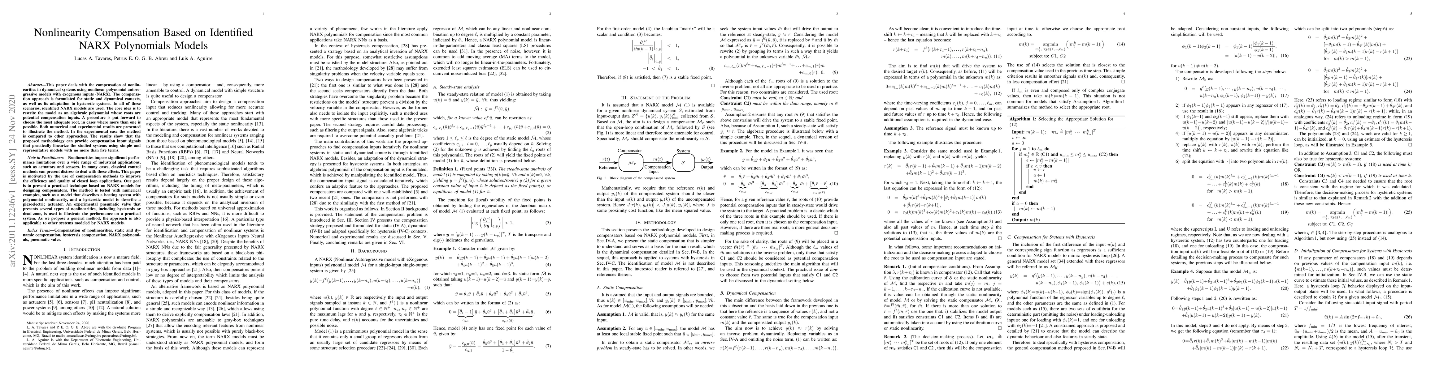 This paper deals with the compensation of nonlinearities in dynamical systems using nonlinear polynomial autoregressive models with exogenous inputs (NARX). The compensation approach is formulated for static and dynamical contexts, as well as its adaptation to hysteretic systems. In all of these scenarios, identified NARX models are used. The core idea is to rewrite the model as an algebraic polynomial whose roots are potential compensation inputs. A procedure is put forward to choose the most adequate root, in cases where more than one is possible. Both numerical and experimental results are presented to illustrate the method. In the experimental case the method is compared to other approaches. The results show that the proposed methodology can provide compensation input signals that practically linearize the studied systems using simple and representative models with no more than five terms.