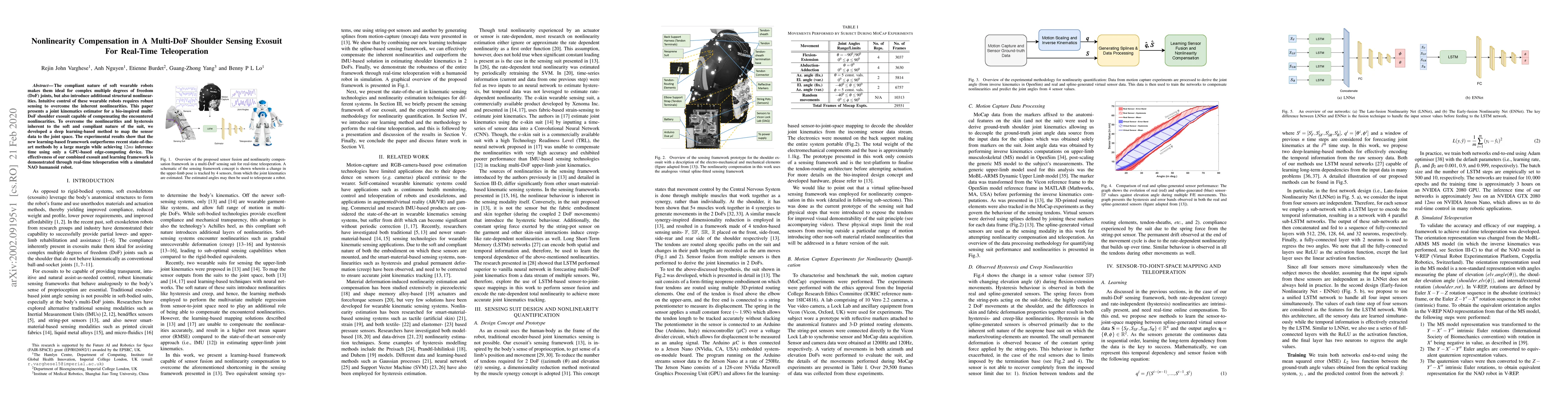 The compliant nature of soft wearable robots makes them ideal for complex multiple degrees of freedom (DoF) joints, but also introduce additional structural nonlinearities. Intuitive control of these wearable robots requires robust sensing to overcome the inherent nonlinearities. This paper presents a joint kinematics estimator for a bio-inspired multi-DoF shoulder exosuit capable of compensating the encountered nonlinearities. To overcome the nonlinearities and hysteresis inherent to the soft and compliant nature of the suit, we developed a deep learning-based method to map the sensor data to the joint space. The experimental results show that the new learning-based framework outperforms recent state-of-the-art methods by a large margin while achieving 12ms inference time using only a GPU-based edge-computing device. The effectiveness of our combined exosuit and learning framework is demonstrated through real-time teleoperation with a simulated NAO humanoid robot.