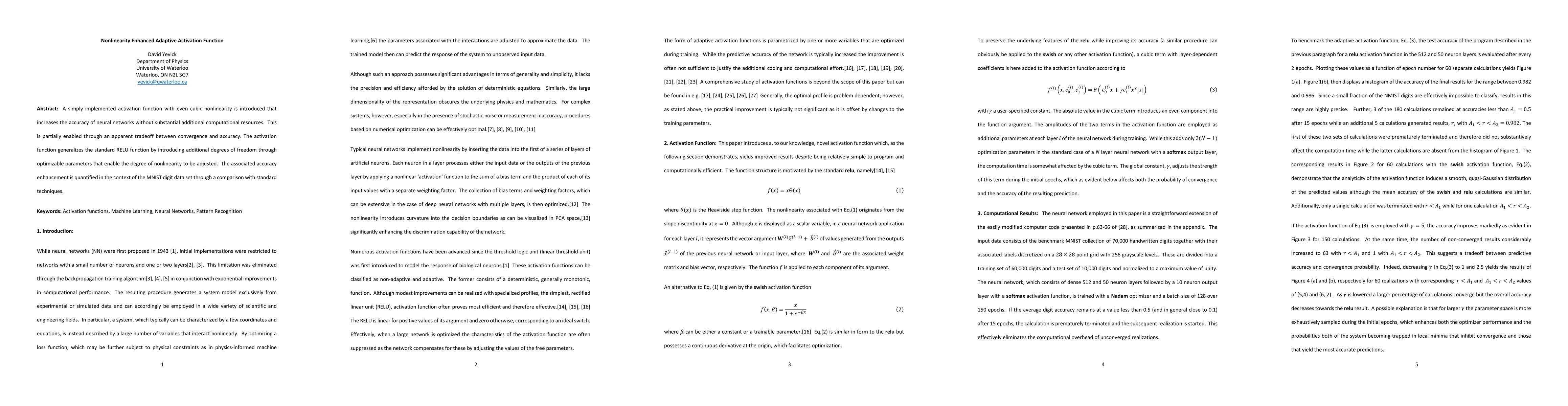 Summary: The paper introduces a new adaptive activation function with cubic nonlinearity that enhances neural network accuracy with minimal extra computational cost, offering improved performance on the MNIST dataset compared to standard methods. The function generalizes RELU by allowing adjustable nonlinearity through optimizable parameters.