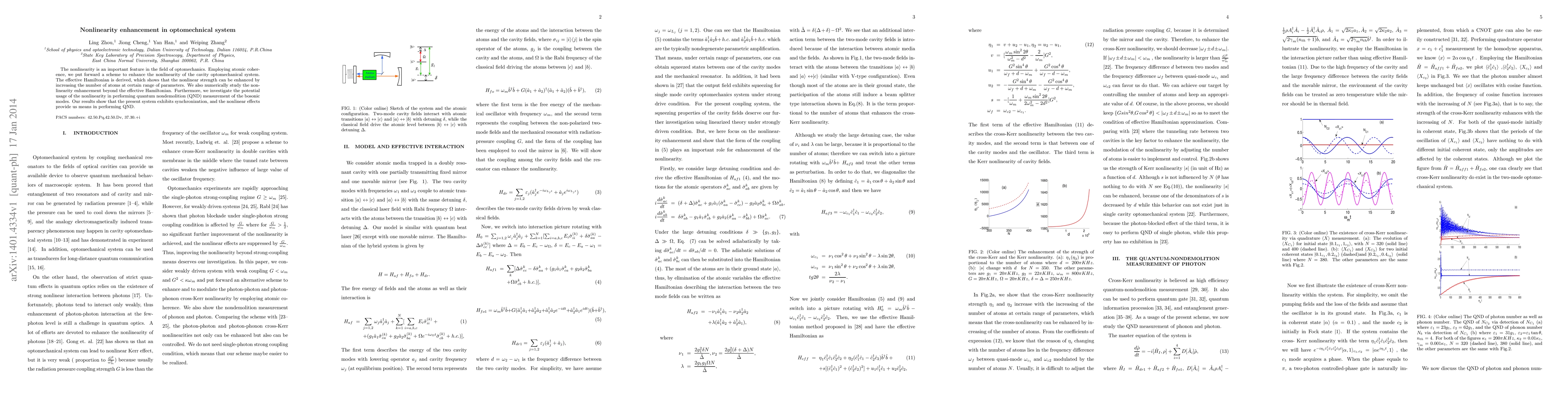 The nonlinearity is an important feature in the field of optomechanics. Employing atomic coherence, we put forward a scheme to enhance the nonlinearity of the cavity optomechanical system. The effective Hamiltonian is derived, which shows that the nonlinear strength can be enhanced by increasing the number of atoms at certain range of parameters. We also numerically study the nonlinearity enhancement beyond the effective Hamiltonian. Furthermore, we investigate the potential usage of the nonlinearity in performing quantum nondemolition (QND) measurement of the bosonic modes. Our results show that the present system exhibits synchronization, and the nonlinear effects provide us an effective method in performing QND.