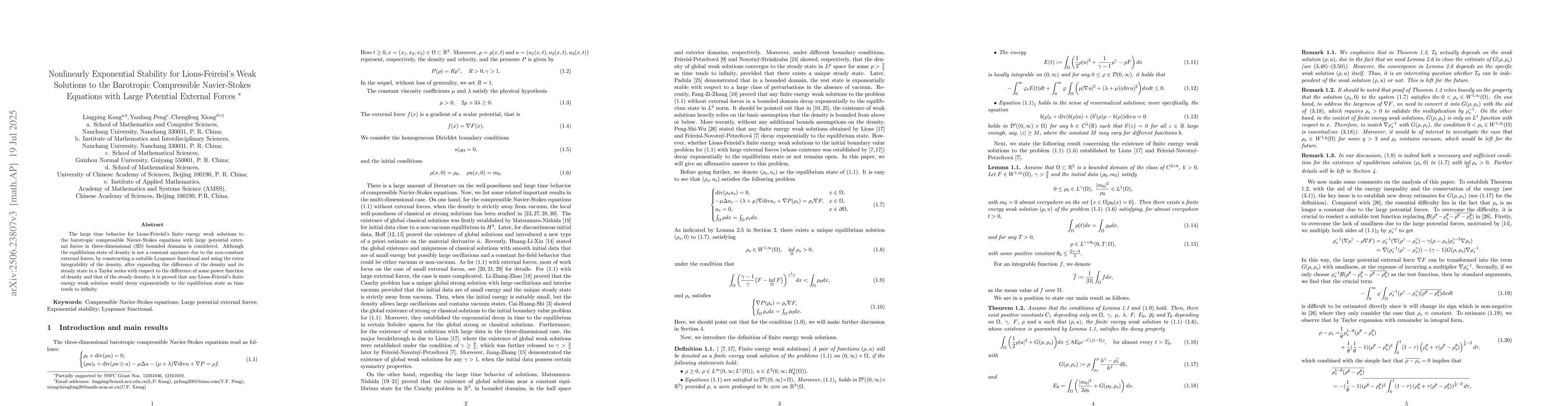 We consider the large-time behavior for the barotropic compressible Navier-Stokes equations with large external force in 3D bounded domain. By constructing a suitable Lyapunov functional and using the extra integrability of the density, we state the exponentially decay-in-time to the equilibrium state for Lions-Feireisl's finite-energy weak solutions. In addition, some careful discussion on Taylor expansion also plays a crucial role in our analysis. The main difficulty lies in the fact that the equilibrium state of density is not a constant anymore induced by the large external force. It should be noted that our result can be regarded as an extension of \cite{PSW} to large potential forces case.