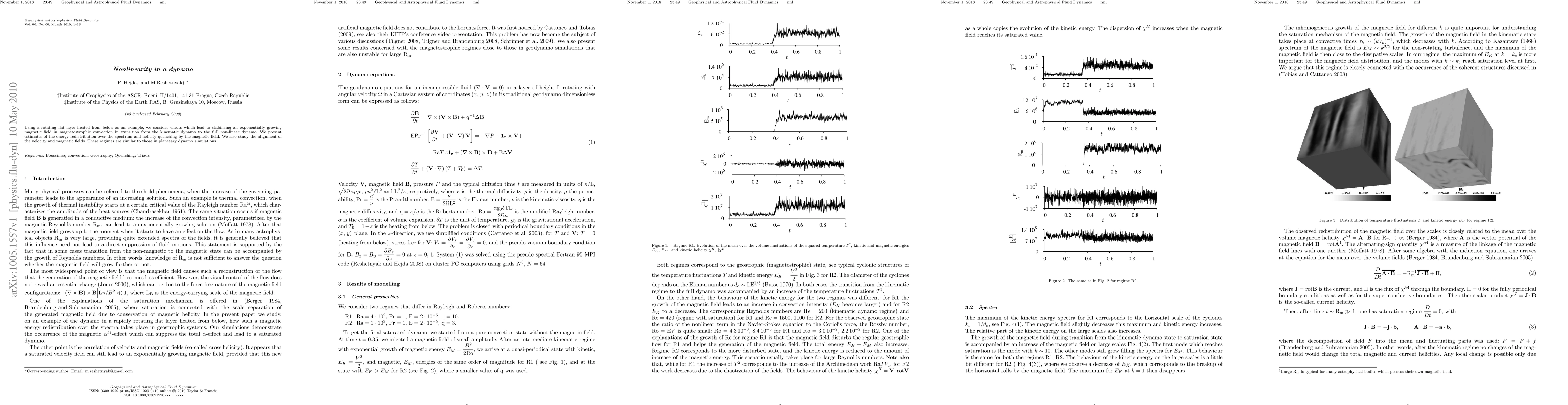 Researchers studied nonlinear effects in a magnetic field that grows exponentially, finding energy redistribution and helicity quenching, similar to planetary dynamo simulations.