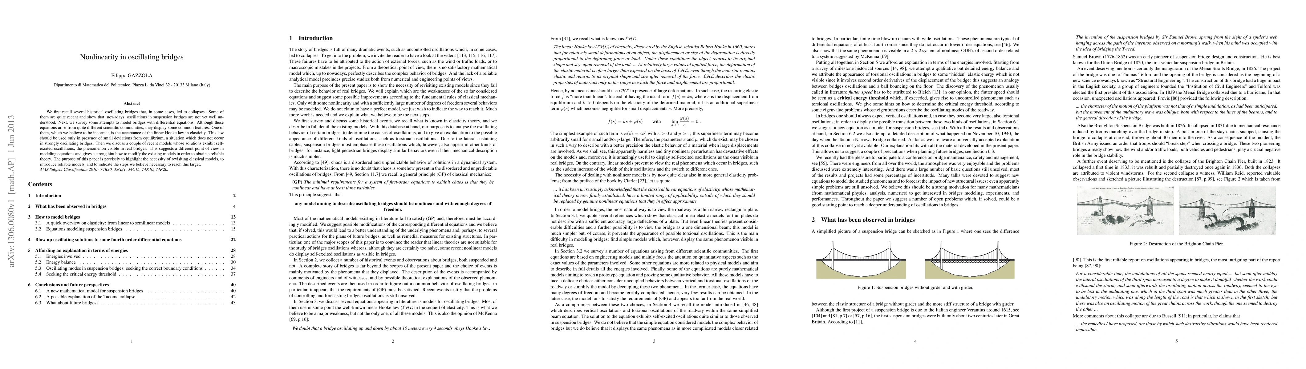 The research examines historical oscillating bridges, reviews existing models using differential equations, and critiques the application of Hooke's linear law in elasticity for large oscillations.