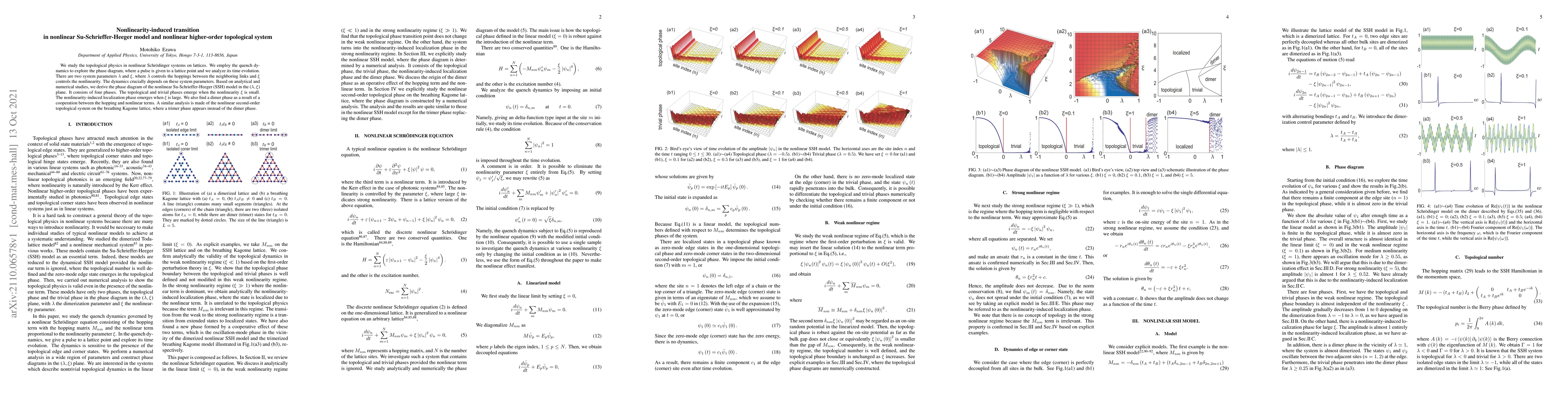 We study the topological physics in nonlinear Schr\"{o}dinger systems on lattices. We employ the quench dynamics to explore the phase diagram, where a pulse is given to a lattice point and we analyze its time evolution. There are two system parameters $\lambda $ and $\xi $, where $\lambda $ controls the hoppings between the neighboring links and $\xi $ controls the nonlinearity. The dynamics crucially depends on these system parameters. Based on analytical and numerical studies, we derive the phase diagram of the nonlinear Su-Schrieffer-Heeger (SSH) model in the ($\lambda ,\xi $) plane. It consists of four phases. The topological and trivial phases emerge when the nonlinearity $\xi $ is small. The nonlinearity-induced localization phase emerges when $\xi $ is large. We also find a dimer phase as a result of a cooperation between the hopping and nonlinear terms. A similar analysis is made of the nonlinear second-order topological system on the breathing Kagome lattice, where a trimer phase appears instead of the dimer phase.