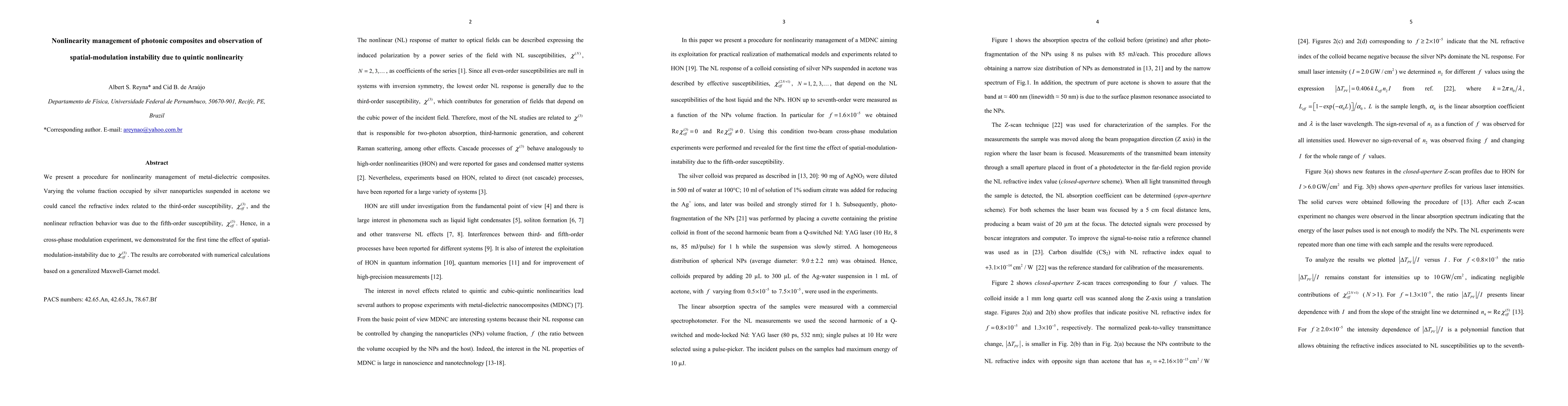 This paper details a method for managing nonlinearity in metal-dielectric photonic composites by adjusting the volume fraction of silver nanoparticles, which cancels third-order susceptibility and reveals fifth-order susceptibility effects. It demonstrates spatial-modulation instability due to the fifth-order susceptibility in a cross-phase modulation experiment, supported by numerical calculations.