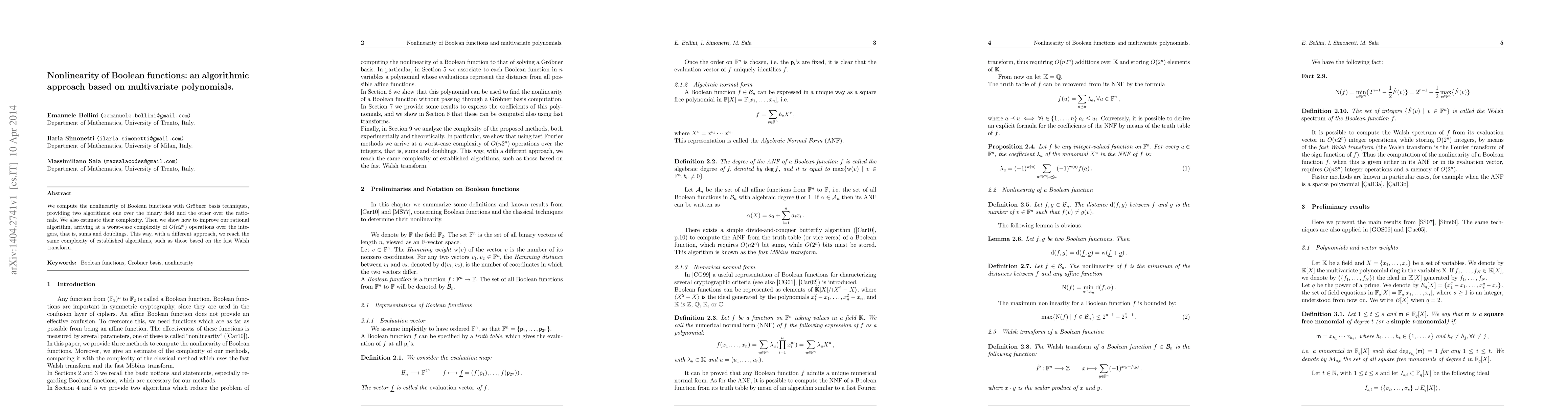 We compute the nonlinearity of Boolean functions with Groebner basis techniques, providing two algorithms: one over the binary field and the other over the rationals. We also estimate their complexity. Then we show how to improve our rational algorithm, arriving at a worst-case complexity of $O(n2^n)$ operations over the integers, that is, sums and doublings. This way, with a different approach, we reach the same complexity of established algorithms, such as those based on the fast Walsh transform.