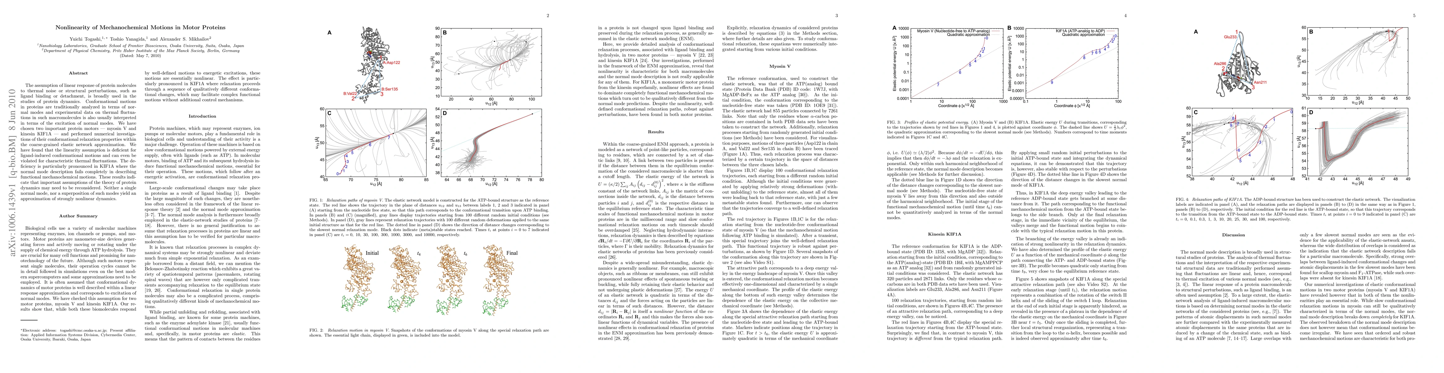 The assumption of linear response of protein molecules to thermal noise or structural perturbations, such as ligand binding or detachment, is broadly used in the studies of protein dynamics. Conformational motions in proteins are traditionally analyzed in terms of normal modes and experimental data on thermal fluctuations in such macromolecules is also usually interpreted in terms of the excitation of normal modes. We have chosen two important protein motors - myosin V and kinesin KIF1A - and performed numerical investigations of their conformational relaxation properties within the coarse-grained elastic network approximation. We have found that the linearity assumption is deficient for ligand-induced conformational motions and can even be violated for characteristic thermal fluctuations. The deficiency is particularly pronounced in KIF1A where the normal mode description fails completely in describing functional mechanochemical motions. These results indicate that important assumptions of the theory of protein dynamics may need to be reconsidered. Neither a single normal mode, nor a superposition of such modes yield an approximation of strongly nonlinear dynamics.