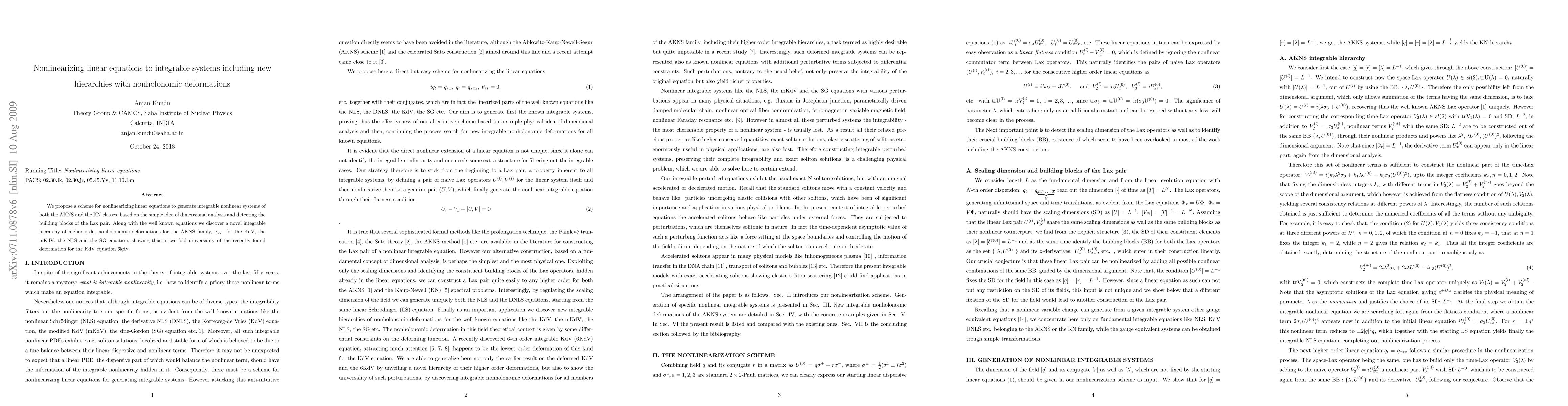 We propose a scheme for nonlinearizing linear equations to generate integrable nonlinear systems of both the AKNS and the KN classes, based on the simple idea of dimensional analysis and detecting the building blocks of the Lax pair. Along with the well known equations we discover a novel integrable hierarchy of higher order nonholonomic deformations for the AKNS family, e.g. for the KdV, the mKdV, the NLS and the SG equation, showing thus a two-fold universality of the recently found deformation for the KdV equation.