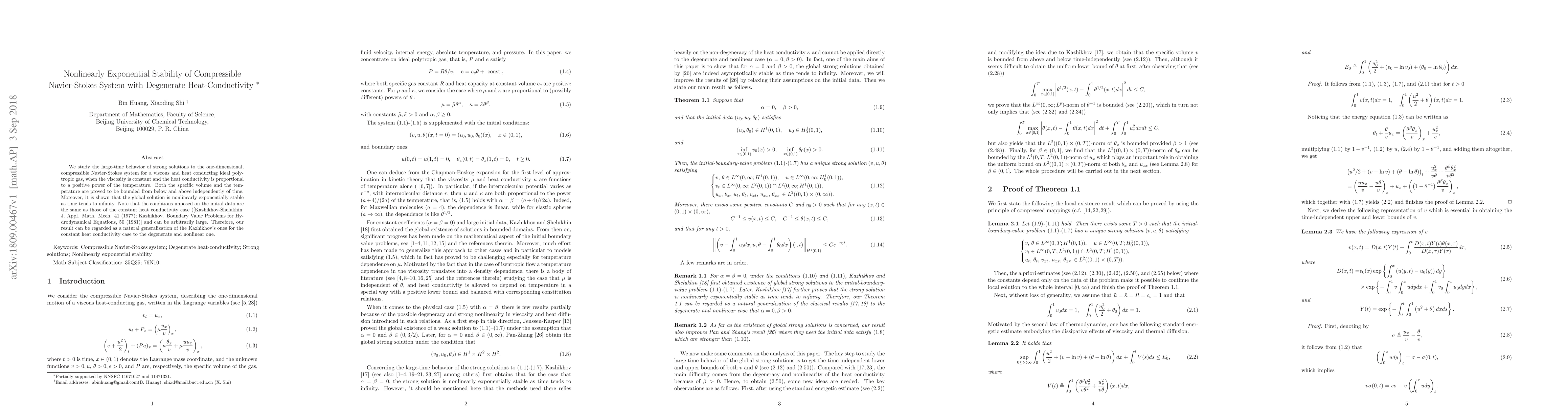 The paper establishes bounds on specific volume and temperature and proves nonlinear exponential stability for a generalized compressible Navier-Stokes system with degenerate heat conductivity.