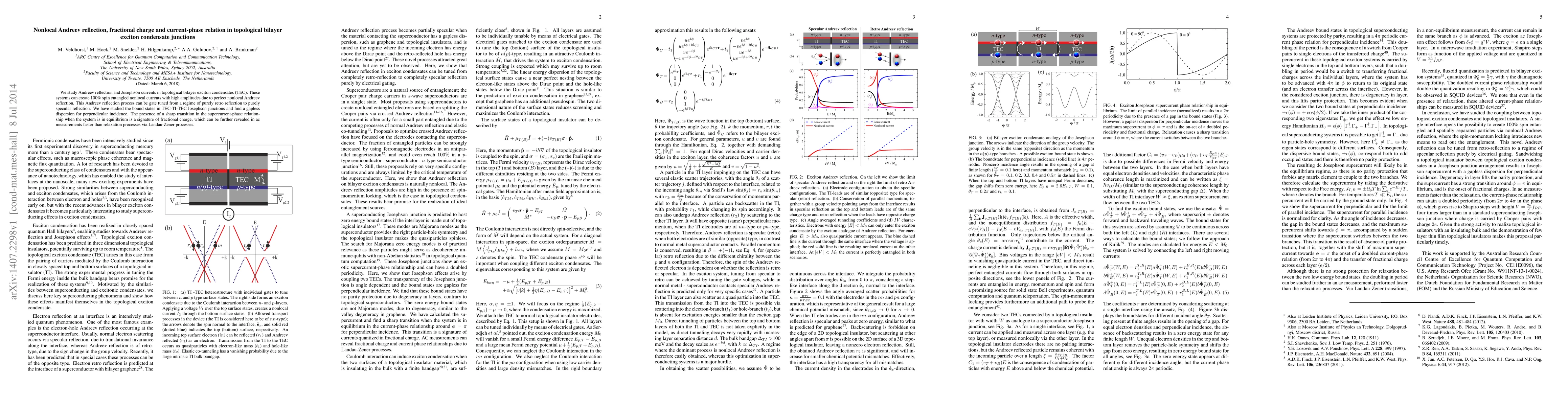 This paper investigates topological bilayer exciton condensates (TEC) and their Andreev reflection and Josephson current characteristics, revealing 100% spin entangled nonlocal currents. The study finds a sharp transition in the supercurrent-phase relationship indicating fractional charge, observable via rapid ac measurements.