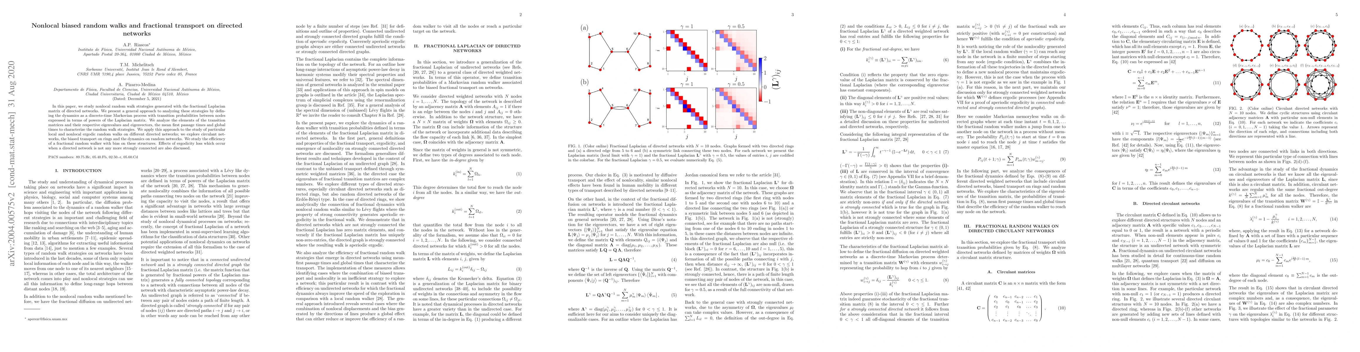 This paper investigates nonlocal biased random walks on directed networks using fractional Laplacian matrices, modeling the dynamics as a discrete-time Markovian process. It analyzes transition matrices, eigenvalues, and mean first passage times to characterize these random walks, applying the approach to circulant networks, biased transport on rings, and random networks, and discusses the impact of ergodicity loss in non-strongly connected networks.