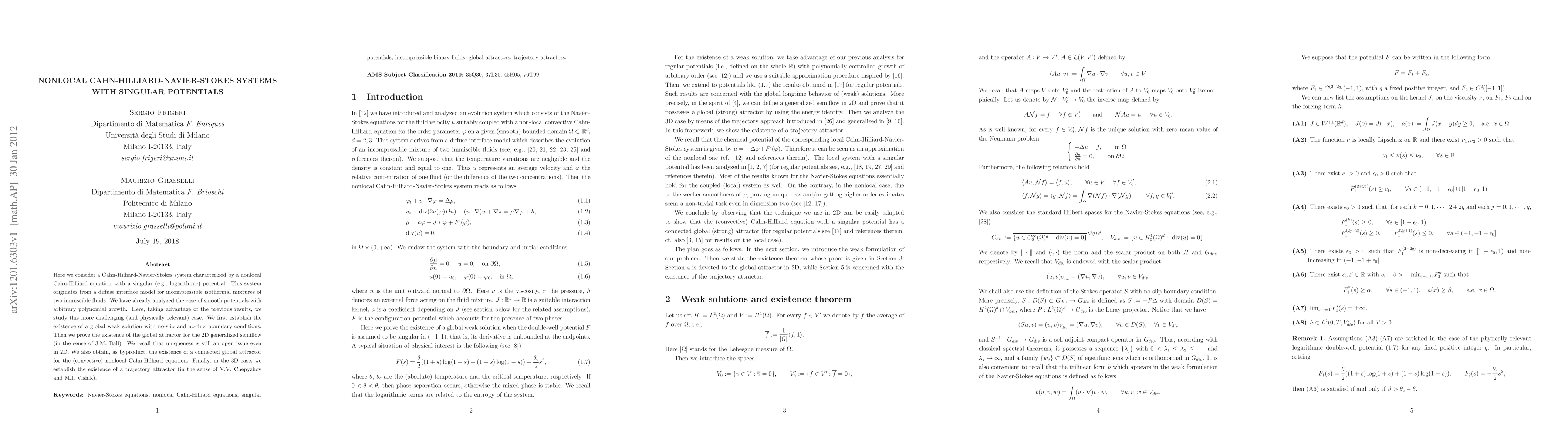 This paper investigates a nonlocal Cahn-Hilliard-Navier-Stokes system with singular potentials, establishing the existence of global weak solutions and global attractors in 2D, and a trajectory attractor in 3D, while noting the open issue of uniqueness.