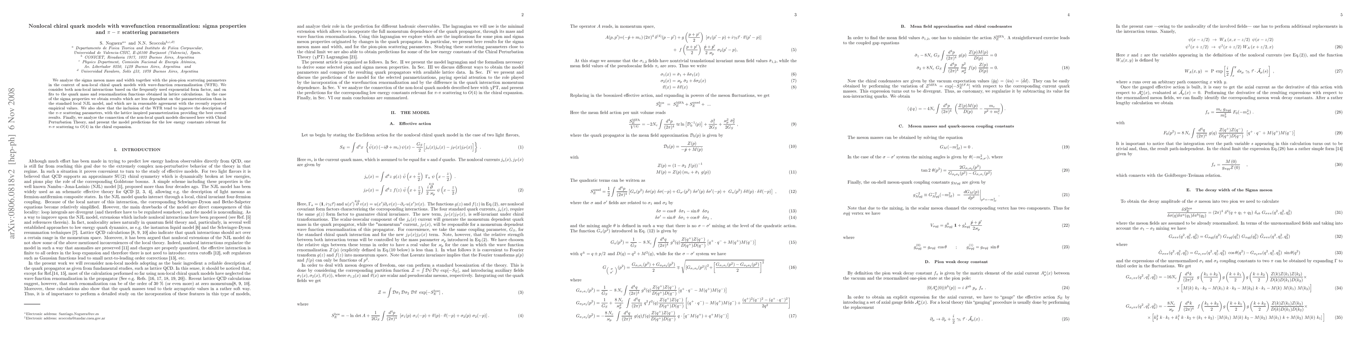 This study improves predictions for sigma meson mass, width, pion-pion scattering parameters, and low energy constants using non-local chiral quark models with wavefunction renormalization, achieving better agreement with empirical values than standard local models.