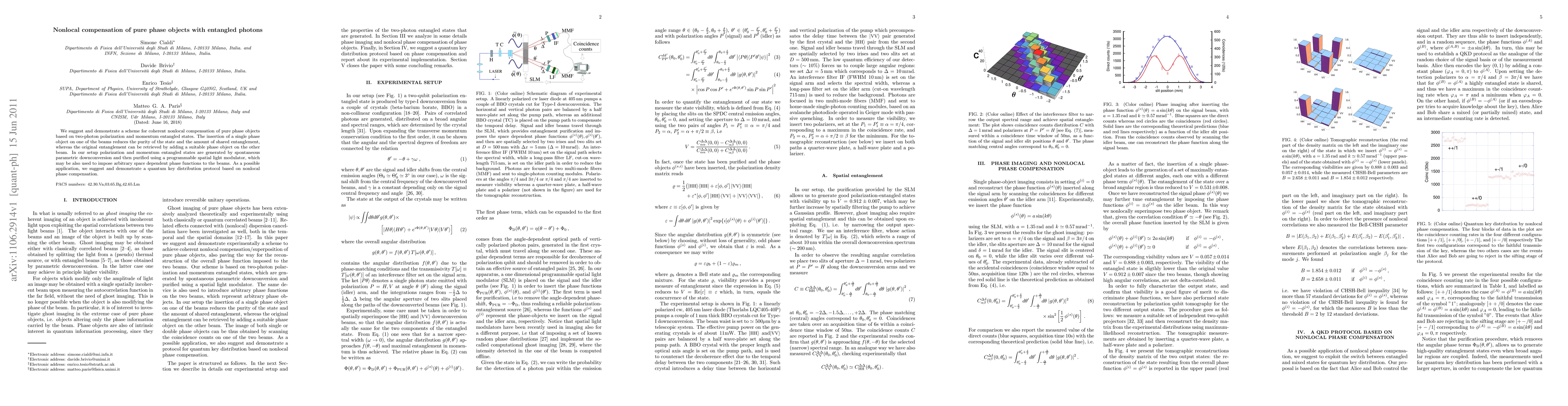 We suggest and demonstrate a scheme for coherent nonlocal compensation of pure phase objects based on two-photon polarization and momentum entangled states. The insertion of a single phase object on one of the beams reduces the purity of the state and the amount of shared entanglement, whereas the original entanglement can be retrieved by adding a suitable phase object on the other beam. In our setup polarization and momentum entangled states are generated by spontaneous parametric downconversion and then purified using a programmable spatial light modulator, which may be also used to impose arbitrary space dependent phase functions to the beams. As a possible application, we suggest and demonstrate a quantum key distribution protocol based on nonlocal phase compensation.