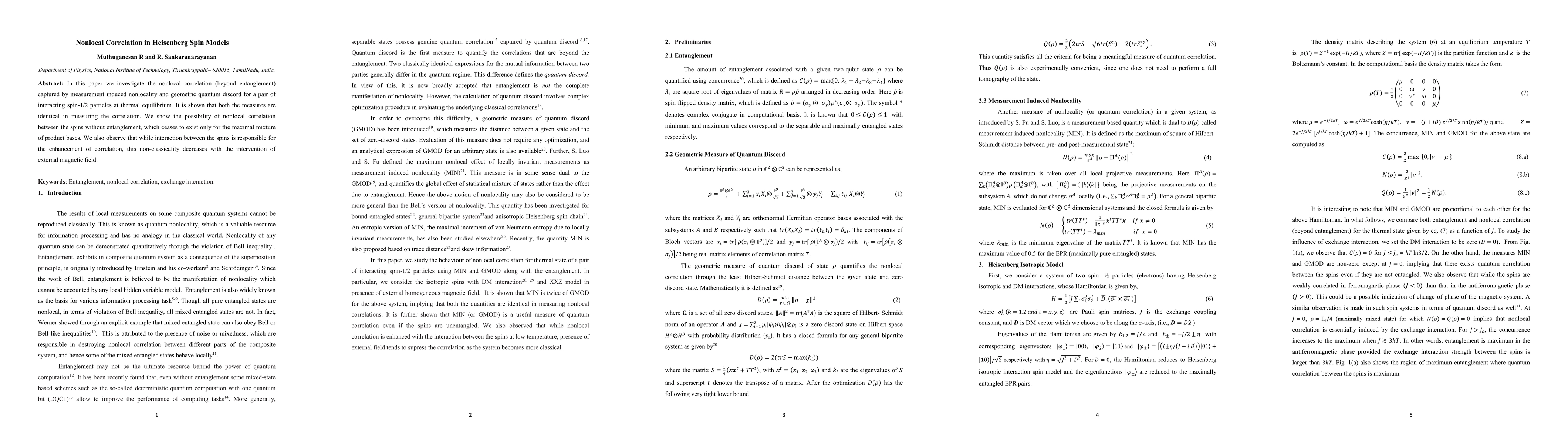 This paper explores nonlocal correlation beyond entanglement in Heisenberg spin models, demonstrating that measurement induced nonlocality and geometric quantum discord are equivalent measures. It reveals nonlocal correlation between spin-1/2 particles without entanglement, which diminishes only in maximal product basis mixtures and is reduced by external magnetic fields.