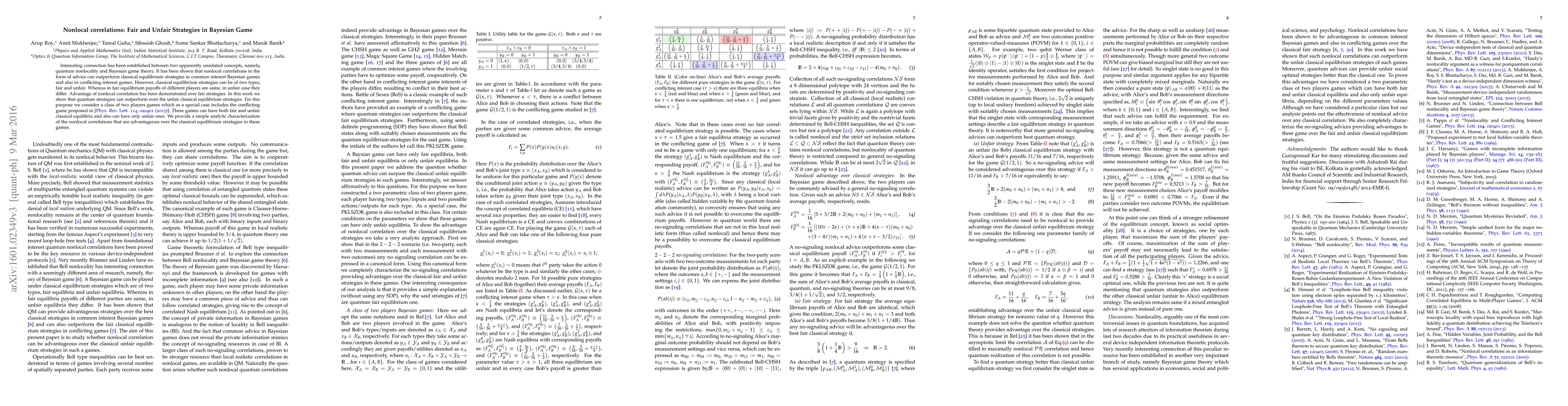 This paper explores the connection between quantum nonlocal correlations and Bayesian game theory, demonstrating that quantum strategies can outperform both fair and unfair classical equilibrium strategies in a class of two-player games, including conflicting interest scenarios. It provides an analytic characterization of advantageous nonlocal correlations.