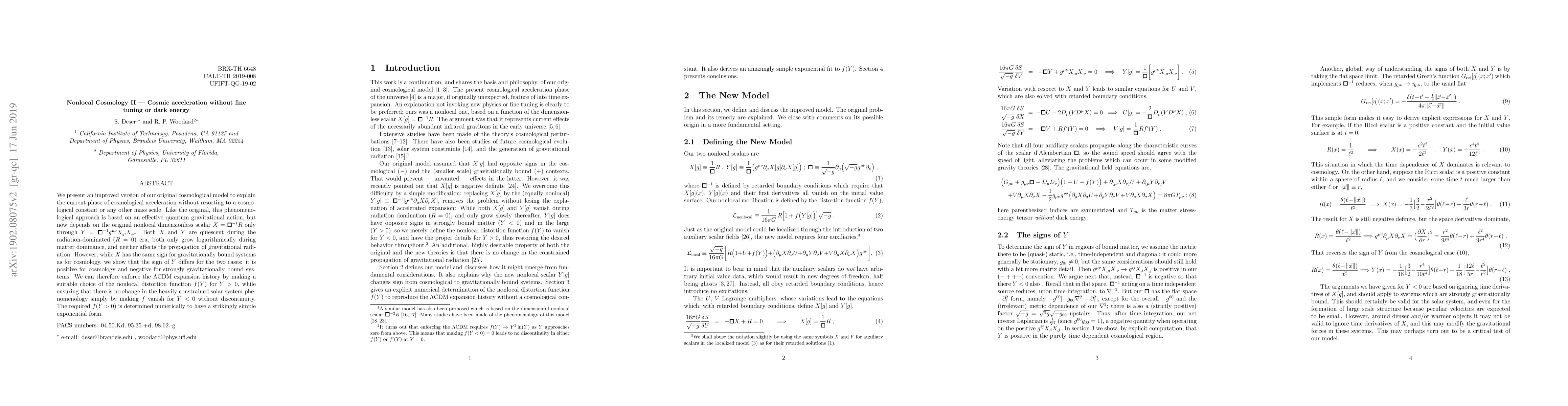 We present an improved version of our original cosmological model to explain the current phase of cosmological acceleration without resorting to a cosmological constant or any other mass scale. Like the original, this phenomenological approach is based on an effective quantum gravitational action, but now depends on the original nonlocal dimensionless scalar $X = \square^{-1} R$ only through $Y = \square^{-1} g^{\mu\nu} X_{,\mu} X_{,\nu}$. Both $X$ and $Y$ are quiescent during the radiation-dominated ($R=0$) era, both only grow logarithmically during matter dominance, and neither affects the propagation of gravitational radiation. However, while $X$ has the same sign for gravitationally bound systems as for cosmology, we show that the sign of $Y$ differs for the two cases: it is positive for cosmology and negative for strongly gravitationally bound systems. We can therefore enforce the $\Lambda$CDM expansion history by making a suitable choice of the nonlocal distortion function $f(Y)$ for $Y > 0$, while ensuring that there is no change in the heavily constrained solar system phenomenology simply by making $f$ vanish for $Y < 0$ without discontinuity. The required $f(Y>0)$ is determined numerically to have a strikingly simple exponential form.