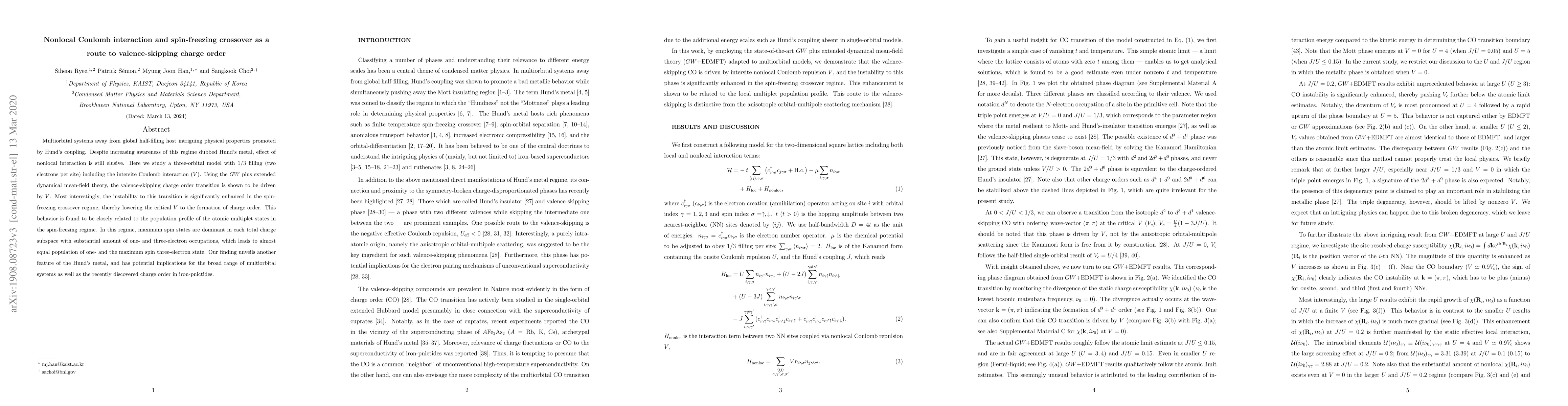 Multiorbital systems away from global half-filling host intriguing physical properties promoted by Hund's coupling. Despite increasing awareness of this regime dubbed Hund's metal, effect of nonlocal interaction is still elusive. Here we study a three-orbital model with $1/3$ filling (two electrons per site) including the intersite Coulomb interaction ($V$). Using the $GW$ plus extended dynamical mean-field theory, the valence-skipping charge order transition is shown to be driven by $V$. Most interestingly, the instability to this transition is significantly enhanced in the spin-freezing crossover regime, thereby lowering the critical $V$ to the formation of charge order. This behavior is found to be closely related to the population profile of the atomic multiplet states in the spin-freezing regime. In this regime, maximum spin states are dominant in each total charge subspace with substantial amount of one- and three-electron occupations, which leads to almost equal population of one- and the maximum spin three-electron state. Our finding unveils another feature of the Hund's metal, and has potential implications for the broad range of multiorbital systems as well as the recently discovered charge order in iron-pnictides.