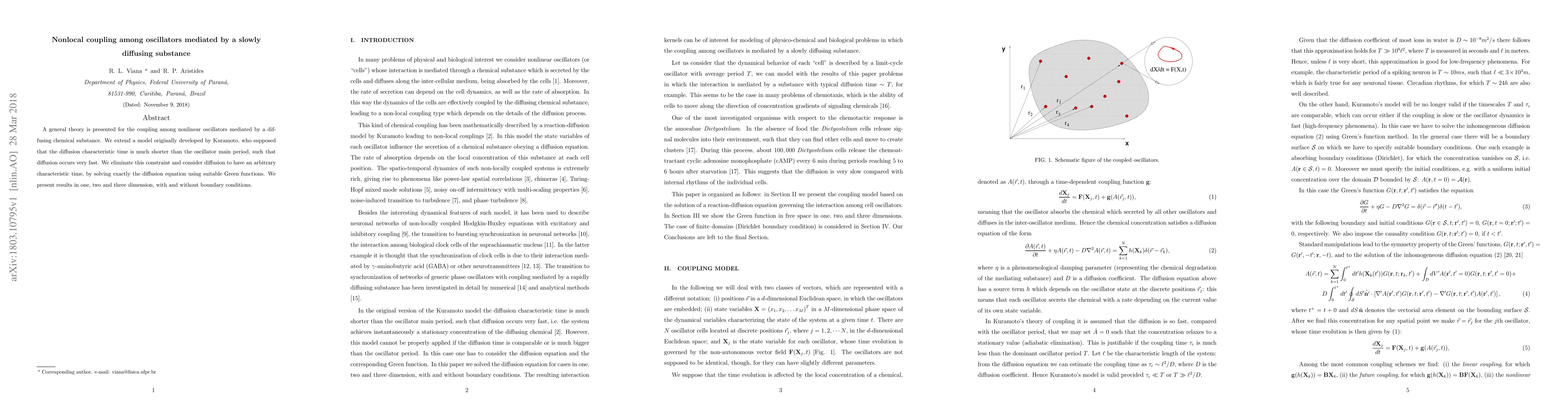A general theory is presented for the coupling among nonlinear oscillators mediated by a diffusing chemical substance. We extend a model originally developed by Kuramoto, who supposed that the diffusion characteristic time is much shorter than the oscillator main period, such that diffusion occurs very fast. We eliminate this constraint and consider diffusion to have an arbitrary characteristic time, by solving exactly the diffusion equation using suitable Green functions. We present results in one, two and three dimension, with and without boundary conditions.