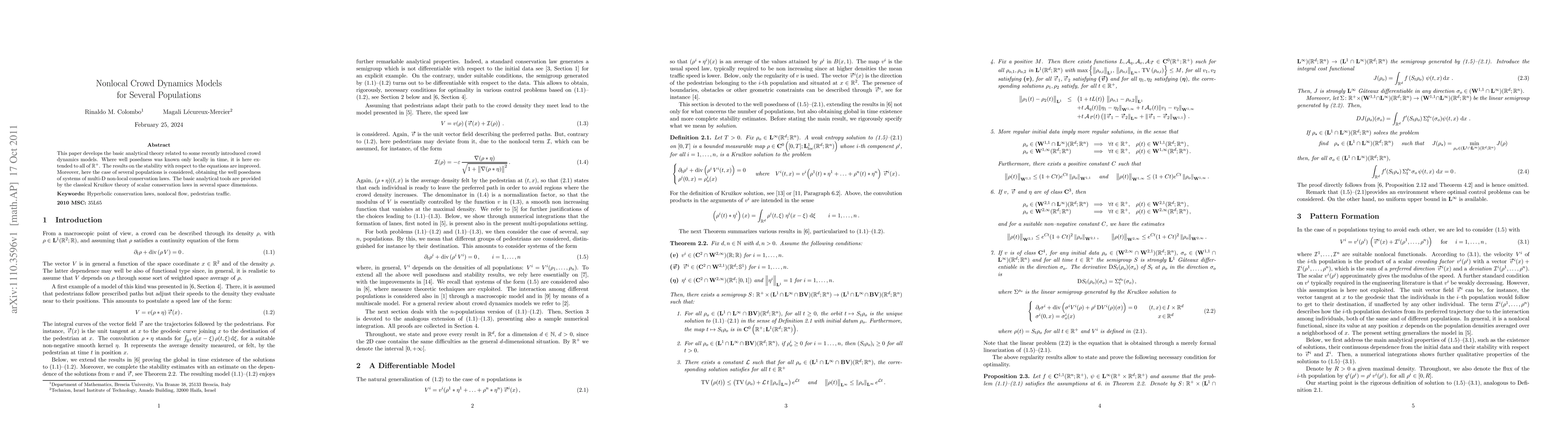 This paper develops the basic analytical theory related to some recently introduced crowd dynamics models. Where well posedness was known only locally in time, it is here extended to all of $\reali^+$. The results on the stability with respect to the equations are improved. Moreover, here the case of several populations is considered, obtaining the well posedness of systems of multi-D non-local conservation laws. The basic analytical tools are provided by the classical Kruzkov theory of scalar conservation laws in several space dimensions.