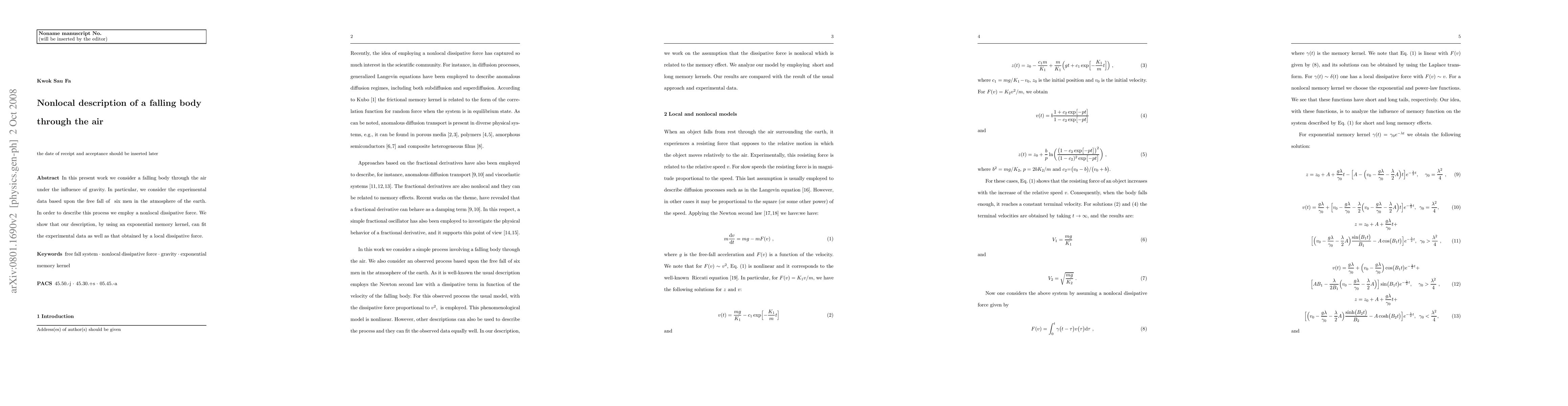 In this present work we consider a falling body through the air under the influence of gravity. In particular, we consider the experimental data based upon the free fall of six men in the atmosphere of the earth. In order to describe this process we employ a nonlocal dissipative force. We show that our description, by using an exponential memory kernel, can fit the experimental data as well as that of a local dissipative force.