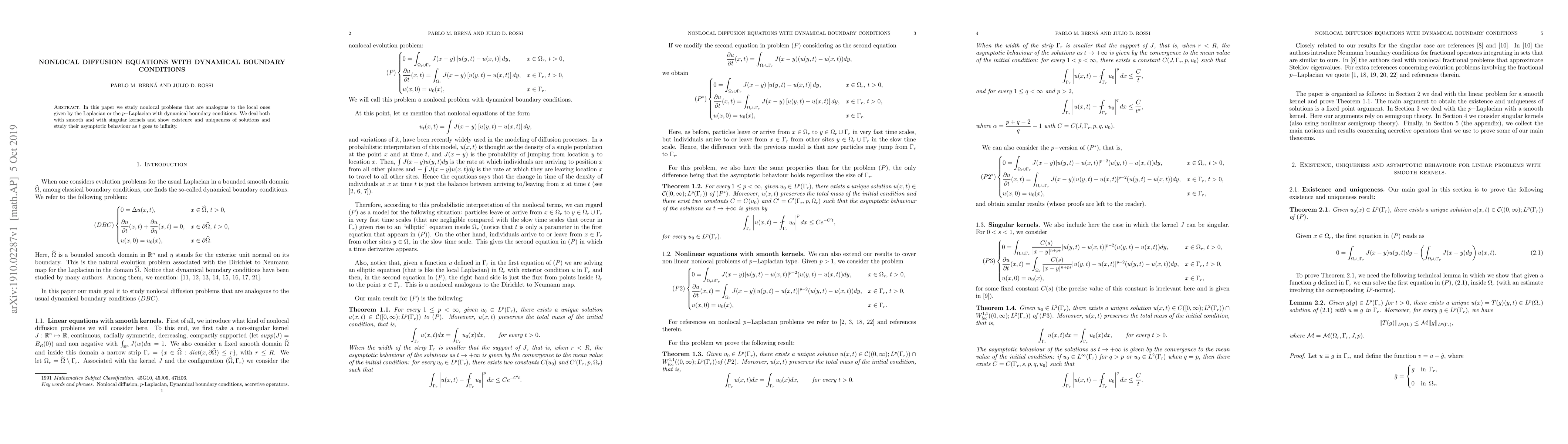 This paper studies nonlocal diffusion equations with dynamic boundary conditions, focusing on existence, uniqueness, and asymptotic behavior of solutions for both smooth and singular kernels.