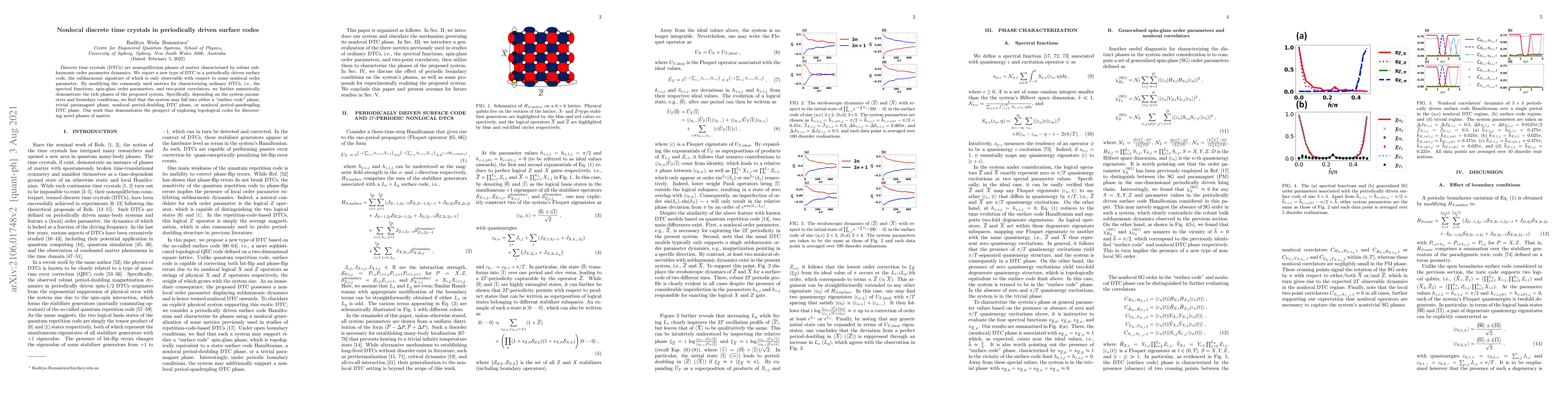 Discrete time crystals (DTCs) are nonequilibrium phases of matter characterized by robust subharmonic order parameter dynamics. We report a new type of DTC in a periodically driven surface code, the subharmonic signature of which is only observable with respect to some nonlocal order parameter. By modifying the commonly used metrics for characterizing ordinary DTCs, i.e., the spectral functions, spin-glass order parameters, and two-point correlators, we numerically investigate the different phases of the proposed system. Specifically, depending on the system parameters and boundary conditions, we find that the system may fall into either a "surface code" phase, trivial paramagnet phase, nonlocal period-doubling DTC phase, or nonlocal period-quadrupling DTC phase. Our work thus demonstrates the prospect of exploring topological codes for discovering novel phases of matter.
