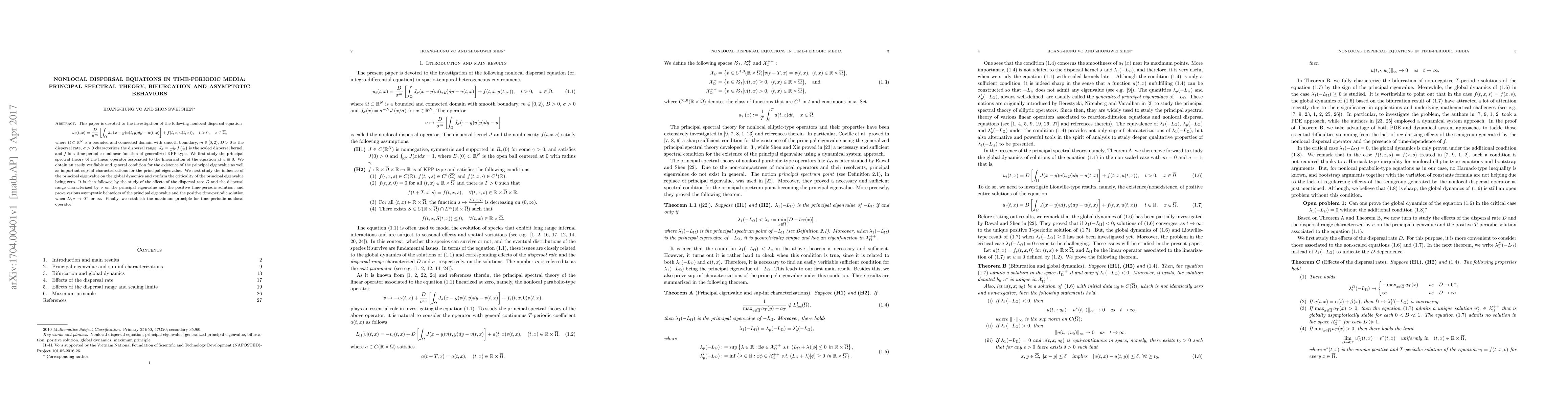 This paper investigates a nonlocal dispersal equation in time-periodic media, focusing on its principal spectral theory, bifurcation phenomena, and asymptotic behaviors. It establishes conditions for the existence of the principal eigenvalue and examines its critical role in global dynamics and solutions.