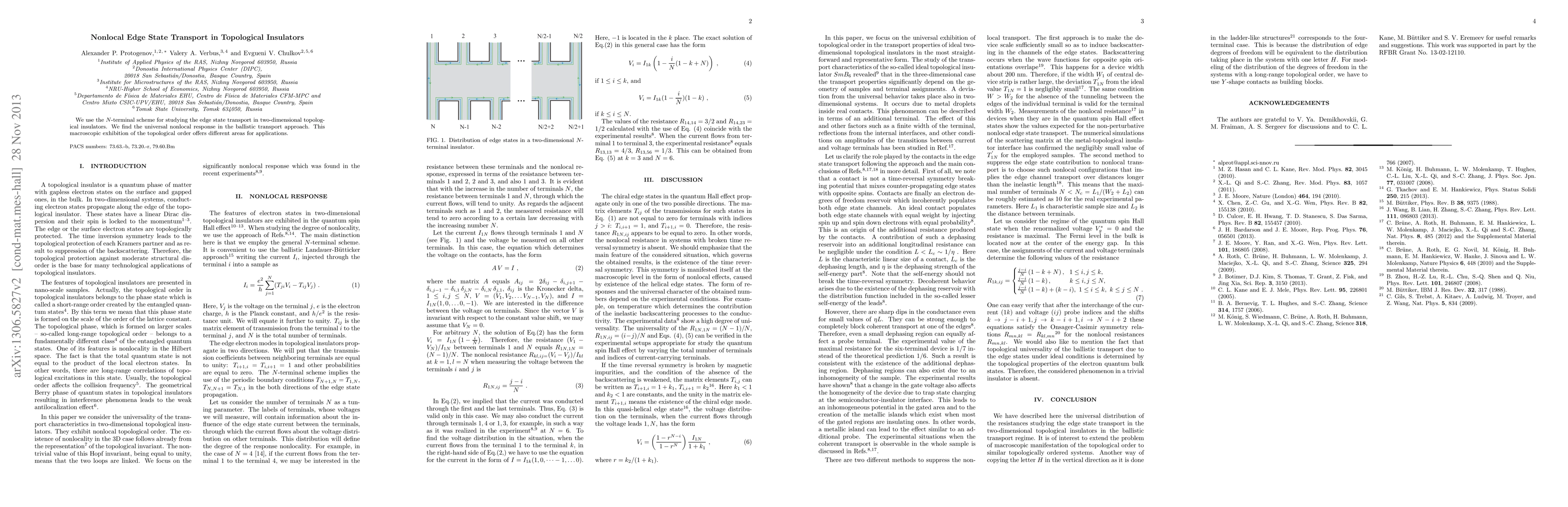 Summary: This research employs the N-terminal scheme to study edge state transport in two-dimensional topological insulators, revealing a universal nonlocal response in ballistic transport that showcases topological order and suggests potential applications.
